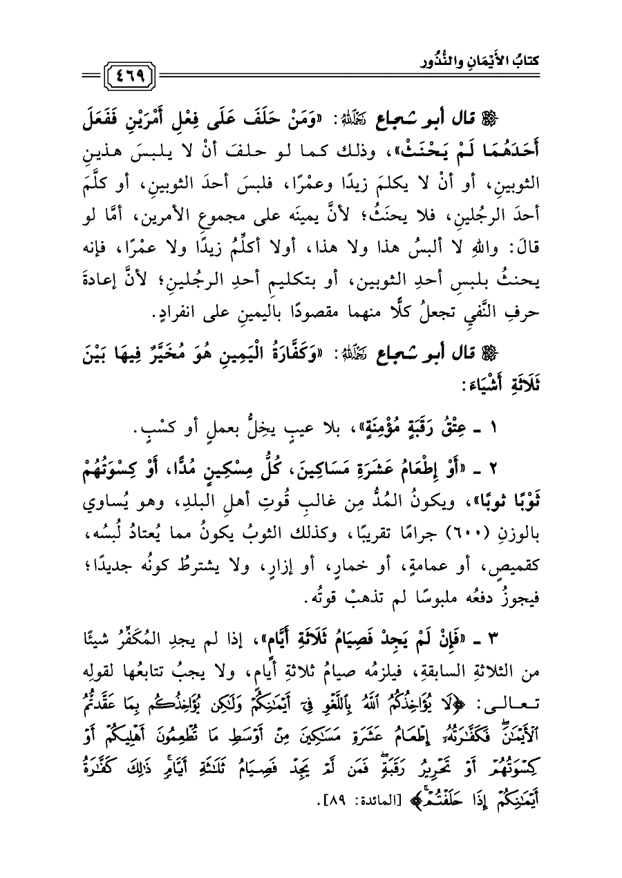 قال أبو شجاع رحمه الله: «وَكَفَّارَةُ الْيَمِينِ هُوَ مُخَيَّرٌ فِيهَا بَيْنَ ثَلَاثَةِ أَشْيَاءَ: