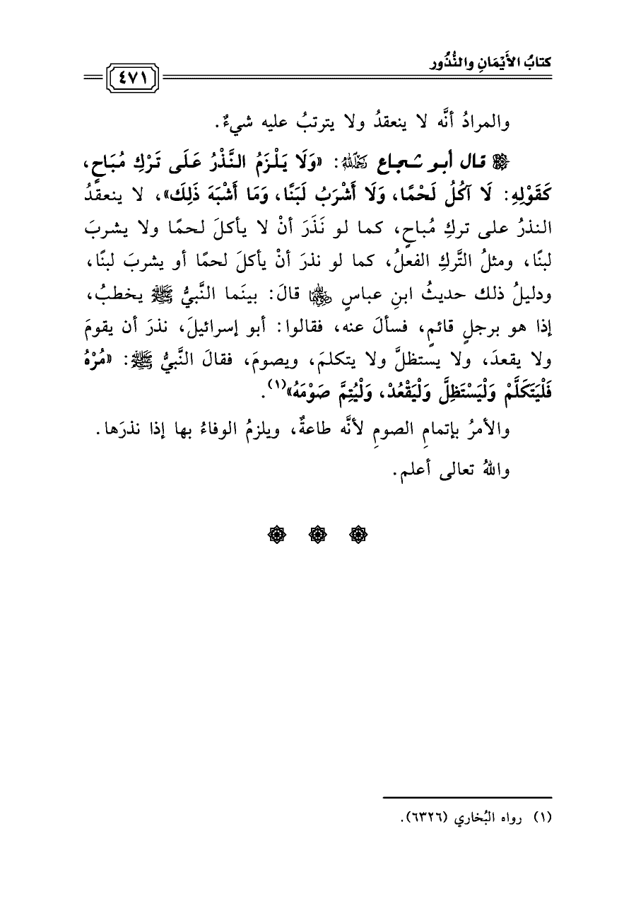قال أبو شجاع رحمه الله: «وَلَا يَلْزَمُ النَّذْرُ عَلَى تَرْكِ مُبَاحٍ، كَقَوْلِهِ: لَا آكُلُ لَحْمًا، وَلَا أَشْرَبُ لَبَنًا، وَمَا أَشْبَهَ ذَلِكَ»، لا ينعقدُ النذرُ على تركِ مُباحٍ، كما لو نَذَرَ أنْ لا يأكلَ لحمًا ولا يشربَ لبنًا، ومثلُ التَّركِ الفعلُ، كما لو نذرَ أنْ يأكلَ لحمًا أو يشربَ لبنًا، ودليلُ ذلك حديثُ ابنِ عباسٍ رضي الله عنهما قالَ: بينَما النَّبيُّ صلى الله عليه وسلم يخطبُ، إذا هو برجلٍ قائمٍ، فسألَ عنه، فقالوا: أبو إسرائيلَ، نذرَ أن يقومَ ولا يقعدَ، ولا يستظلَّ ولا يتكلمَ، ويصومَ، فقالَ النَّبيُّ صلى الله عليه وسلم: «مُرْهُ فَلْيَتَكَلَّمْ وَلْيَسْتَظِلَّ وَلْيَقْعُدْ، وَلْيُتِمَّ صَوْمَهُ» (¬١).