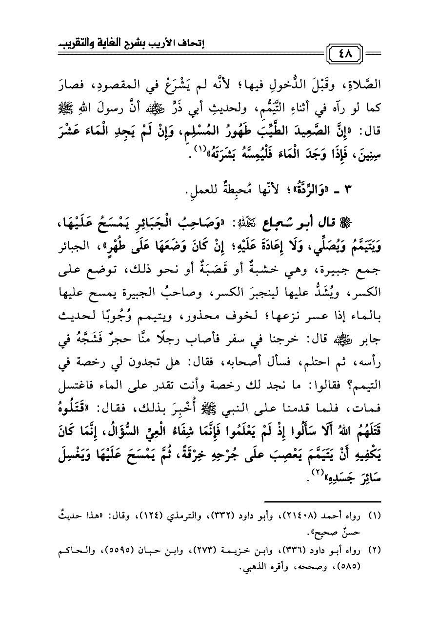 قال أبو شجاع رحمه الله: «وَصَاحِبُ الْجَبَائِرِ يَمْسَحُ عَلَيْهَا، وَيَتَيَمَّمُ وَيُصَلِّي، وَلَا إِعَادَةَ عَلَيْهِ؛ إِنْ كَانَ وَضَعَهَا عَلَى طُهْرٍ»، الجبائر جمع جبيرة، وهي خشبةٌ أو قَصَبَةٌ أو نحو ذلك، توضع على الكسر، ويُشَدُّ عليها لينجبرَ الكسر، وصاحبُ الجبيرة يمسح عليها بالماء إذا عسر نزعها؛ لخوف محذور، ويتيمم وُجُوبًا لحديث جابر رضي الله عنه قال: خرجنا في سفر فأصاب رجلًا منَّا حجرٌ فَشَجَّهُ في رأسه، ثم احتلم، فسأل أصحابه، فقال: هل تجدون لي رخصة في التيمم؟ فقالوا: ما نجد لك رخصة وأنت تقدر على الماء فاغتسل فمات، فلما قدمنا على النبي صلى الله عليه وسلم أُخْبِرَ بذلك، فقال: «قَتَلُوهُ قَتَلَهُمُ اللهُ أَلَا سَأَلُوا إِذْ لَمْ يَعْلَمُوا فَإِنَّمَا شِفَاءُ الْعِيِّ السُّؤَالُ، إِنَّمَا كَانَ يَكْفِيهِ أَنْ يَتَيَمَّمَ يَعْصِبَ علَى جُرْحِهِ خِرْقَةً، ثُمَّ يَمْسَحَ عَلَيْهَا وَيَغْسِلَ سَائِرَ جَسَدِهِ» (¬٢).
