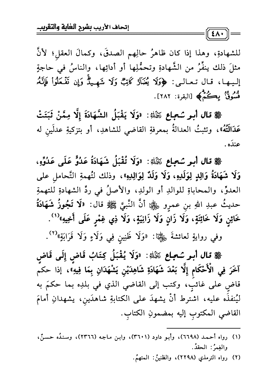 قال أبو شجاع رحمه الله: «وَلَا تُقْبَلُ شَهَادَةُ عَدُوٍّ عَلَى عَدُوِّهِ، وَلَا شَهَادَةُ وَالِدٍ لِوَلَدِهِ، وَلَا وَلَدٌ لِوَالِدِهِ»، وذلك لتُهمةِ التَّحاملِ على العدوِّ، والمحاباةِ للوالدِ أو الولدِ، والأصلُ في ردِّ الشهادةِ للتهمةِ حديثُ عبدِ اللهِ بنِ عمرٍو رضي الله عنهما أنَّ النَّبيَّصلى الله عليه وسلم قال: «لَا تَجُوزُ شَهَادَةُ خَائِنٍ وَلَا خَائِنَةٍ، وَلَا زَانٍ وَلَا زَانِيَةٍ، وَلَا ذِي غِمْرٍ عَلَى أَخِيهِ» (¬١).