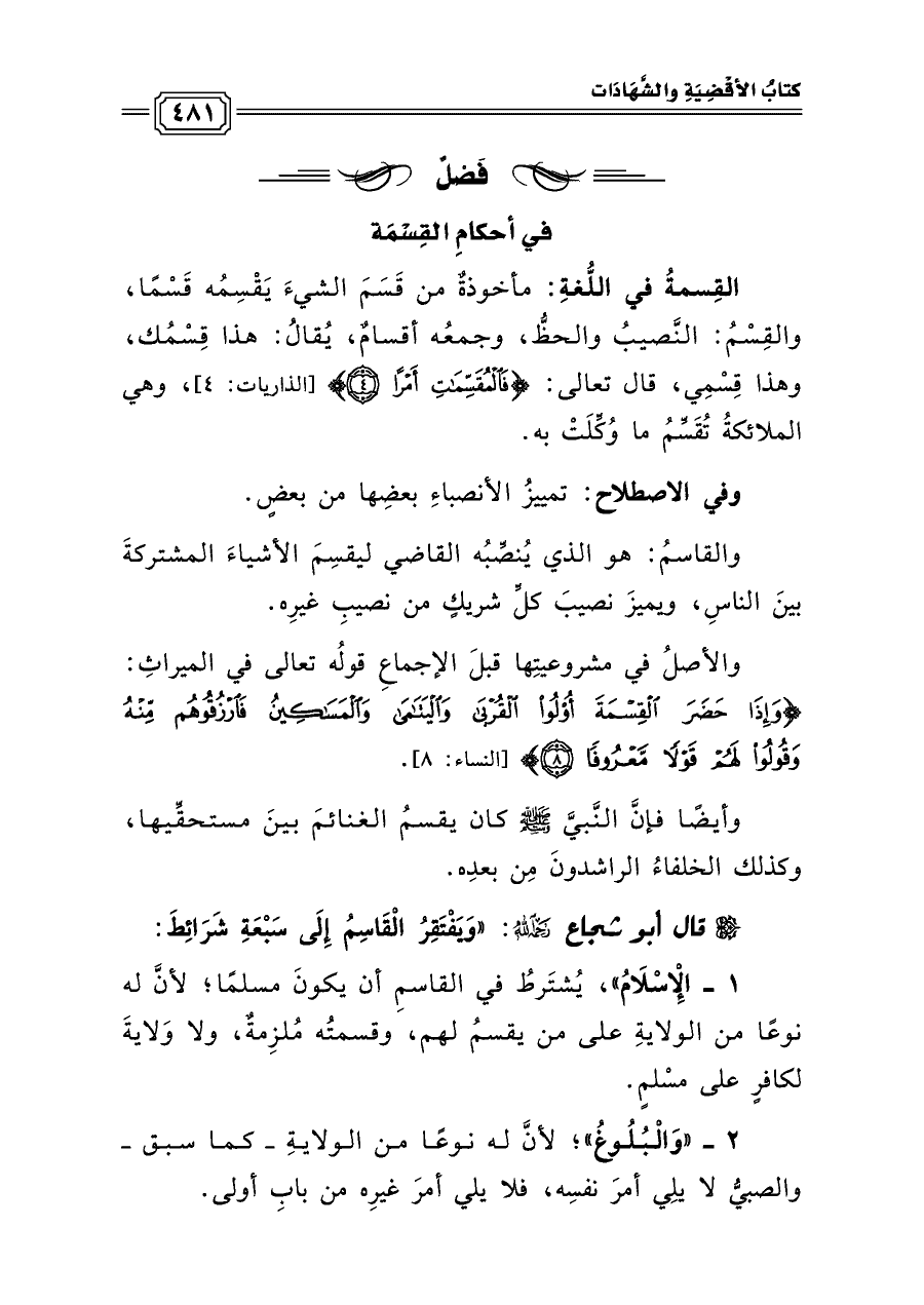 قال أبو شجاع رحمه الله: «وَيَفْتَقِرُ الْقَاسِمُ إِلَى سَبْعَةِ شَرَائِطَ: