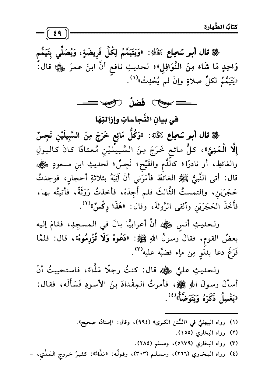 قال أبو شجاع رحمه الله: «وَكُلُّ مَائِعٍ خَرَجَ مِنَ السَّبِيلَيْنِ نَجِسٌ إِلَّا الْمَنِيَّ»، كلُّ مائعٍ خَرَجَ مِنَ السَّبيليْنِ مُعتادًا كانَ كالبولِ والغائطِ، أو نادرًا، كالدَّمِ والقَيْحِ؛ نَجِسٌ؛ لحديثِ ابنِ مسعودٍ رضي الله عنه قال: أتى النَّبيُّ صلى الله عليه وسلم الغائطَ فأمَرَني أنْ آتِيَهُ بثلاثةِ أحجارٍ، فوجدتُ حَجَرَيْنِ، والتمستُ الثَّالثَ فلم أَجِدْهُ، فأخذتُ رَوْثَةً، فأتيتُه بها، فأَخَذَ الحَجَرَيْنِ وألقى الرَّوثةَ، وقال: «هَذَا رِكْسٌ» (¬٢).
