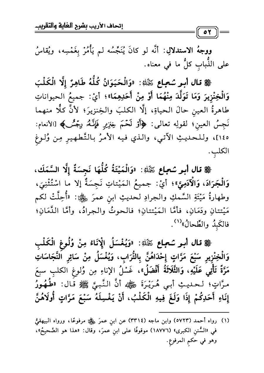 قال أبو شجاع رحمه الله: «وَالْحَيَوَانُ كُلُّهُ طَاهِرٌ إِلَّا الْكَلْبَ وَالْخِنْزِيرَ وَمَا تَوَلَّدَ مِنْهُمَا أَوْ مِنْ أَحَدِهِمَا»؛ أيْ: جميعُ الحيواناتِ طاهرةُ العينِ حالَ الحياةِ، إلَّا الكلبَ والخِنزيرَ؛ لأنَّ كلًّا منهما نَجِسُ العينِ؛ لقولِه تعالى: {أَوْ لَحْمَ خِنْزِيرٍ فَإِنَّهُ رِجْسٌ} [الأنعام: ١٤٥]، وللحديثِ الآتي، والذي فيه الأمرُ بالتَّطهيرِ مِن وُلوغِ الكلبِ.
