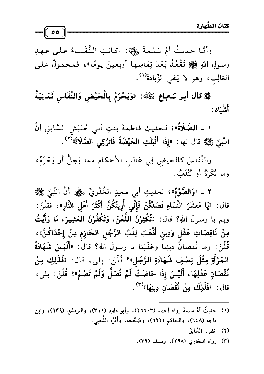 وأمَّا حديثُ أمِّ سَلمةَ رضي الله عنها: «كانتِ النُّفَساءُ على عهدِ رسولِ اللهِ صلى الله عليه وسلم تَقْعُدُ بَعْدَ نِفاسِها أربعينَ يومًا»، فمحمولٌ على الغالِبِ، وهو لا يَنفي الزِّيادةَ (¬١).