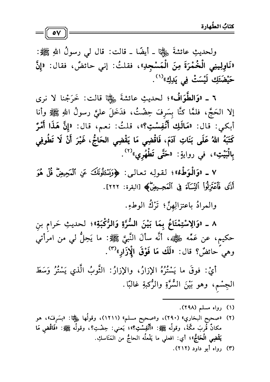 ٨ - «وَالِاسْتِمْتَاعُ بِمَا بَيْنَ السُّرَّةِ وَالرُّكْبَةِ»؛ لحديثِ حَرامِ بنِ حكيمٍ، عن عَمِّه رضي الله عنه، أنَّه سألَ النَّبيَّ صلى الله عليه وسلم: ما يَحِلُّ لي من امرأتي وهي حائضٌ؟ قال: «لَكَ مَا فَوْقَ الْإِزَارِ» (¬٣).