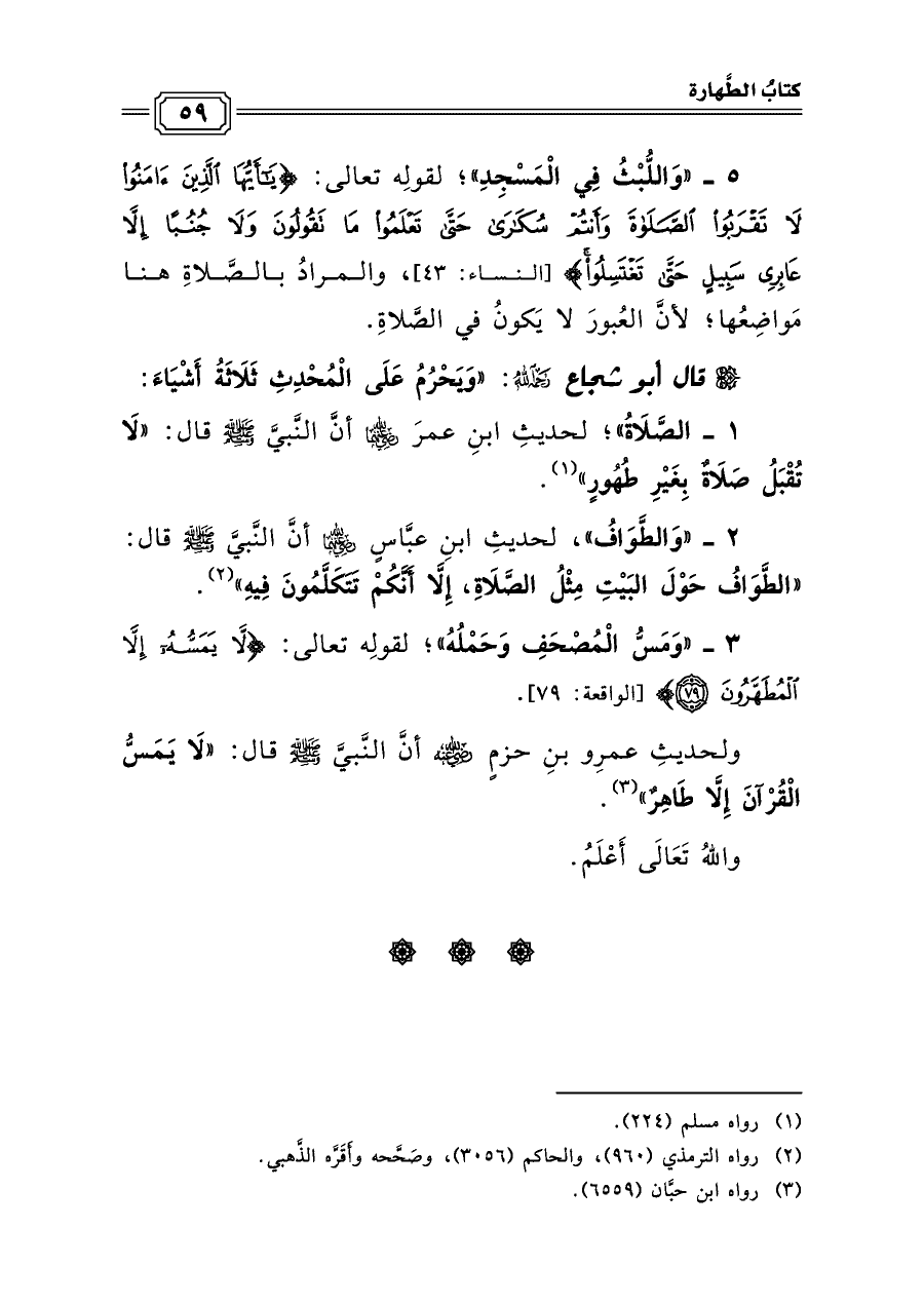 ٣ - «وَمَسُّ الْمُصْحَفِ وَحَمْلُهُ»؛ لقولِه تعالى: {لَا يَمَسُّهُ إِلَّا الْمُطَهَّرُونَ} [الواقعة: ٧٩].