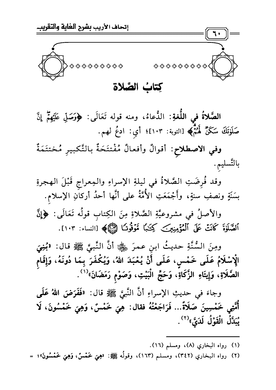(¬٢) رواه البخاري (٣٤٢)، ومسلم (١٦٣)، وقولُه صلى الله عليه وسلم: «هِيَ خَمْسٌ، وَهِيَ خَمْسُونَ»، يعني خمسٌ من حيثُ الفعلُ، وخمسون من حيثُ الأجرُ.