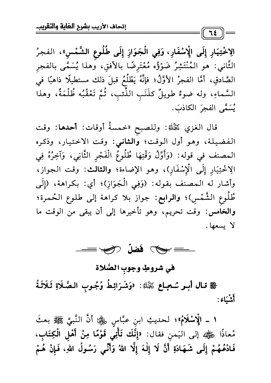 الِاخْتِيَارِ إِلَى الْإِسْفَارِ، وَفِي الْجَوَازِ إِلَى طُلُوعِ الشَّمْسِ»، الفجرُ الثَّاني: هو المُنْتَشِرُ ضَوْؤُه مُعْتَرِضًا بالأفقِ، وهذا يُسَمَّى بالفجرِ الصَّادقِ، أمَّا الفجرُ الأوَّلُ؛ فإنَّهُ يَطْلُعُ قبلَ ذلك مستطيلًا ذاهبًا في السَّماءِ، وله ضوءٌ طويلٌ كذَنَبِ الذِّئبِ، ثُمَّ تَعْقُبُه ظُلْمَةٌ، وهذا يُسَمَّى الفجرَ الكاذبَ.