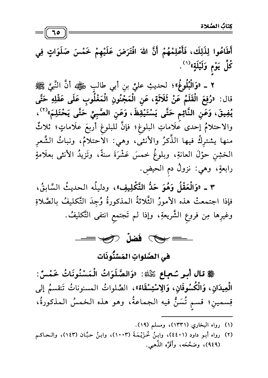 ٢ - «وَالْبُلُوغُ»؛ لحديثِ عليِّ بنِ أبي طالبٍ رضي الله عنه أنَّ النَّبيَّ صلى الله عليه وسلم قال: «رُفِعَ الْقَلَمُ عَنْ ثَلَاثَةٍ، عَنِ الْمَجْنُونِ الْمَغْلُوبِ عَلَى عَقْلِهِ حَتَّى يُفِيقَ، وَعَنِ النَّائِمِ حَتَّى يَسْتَيْقِظَ، وَعَنِ الصَّبِيِّ حَتَّى يَحْتَلِمَ» (¬٢)، والاحتلامُ إحدى علَاماتِ البلوغِ؛ فإنَّ للبلوغِ أربعَ علَاماتٍ؛ ثلاثٌ منها يشترِكُ فيها الذَّكرُ والأنثى، وهي: الاحتلامُ، ونباتُ الشَّعرِ الخشِنِ حوْلَ العانةِ، وبلوغُ خمسَ عَشْرَةَ سنةً، وتَزيدُ الأنثى بعلَامةٍ رابعةٍ، وهي: نزولُ دمِ الحيضِ.