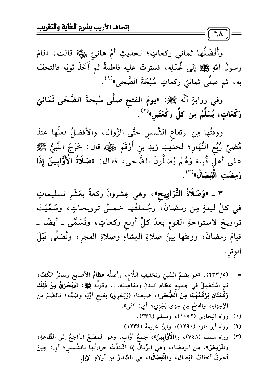 (¬٣) رواه مسلم (٧٤٨)، و «الْأوَّابِينَ»، جمعُ أوَّابٍ، وهو المطيعُ الرَّاجعُ إلى الطَّاعةِ، و «تَرْمِضُ»، مِن الرمضاءِ، وهي الرِّمالُ إذا اشْتَدَّتْ حرارتُها بالشَّمسِ؛ أي: حِينَ تَحترقُ أخفافُ الفِصالِ، و «الْفِصَالُ»، هي الصِّغارُ من أولادِ الإبلِ.