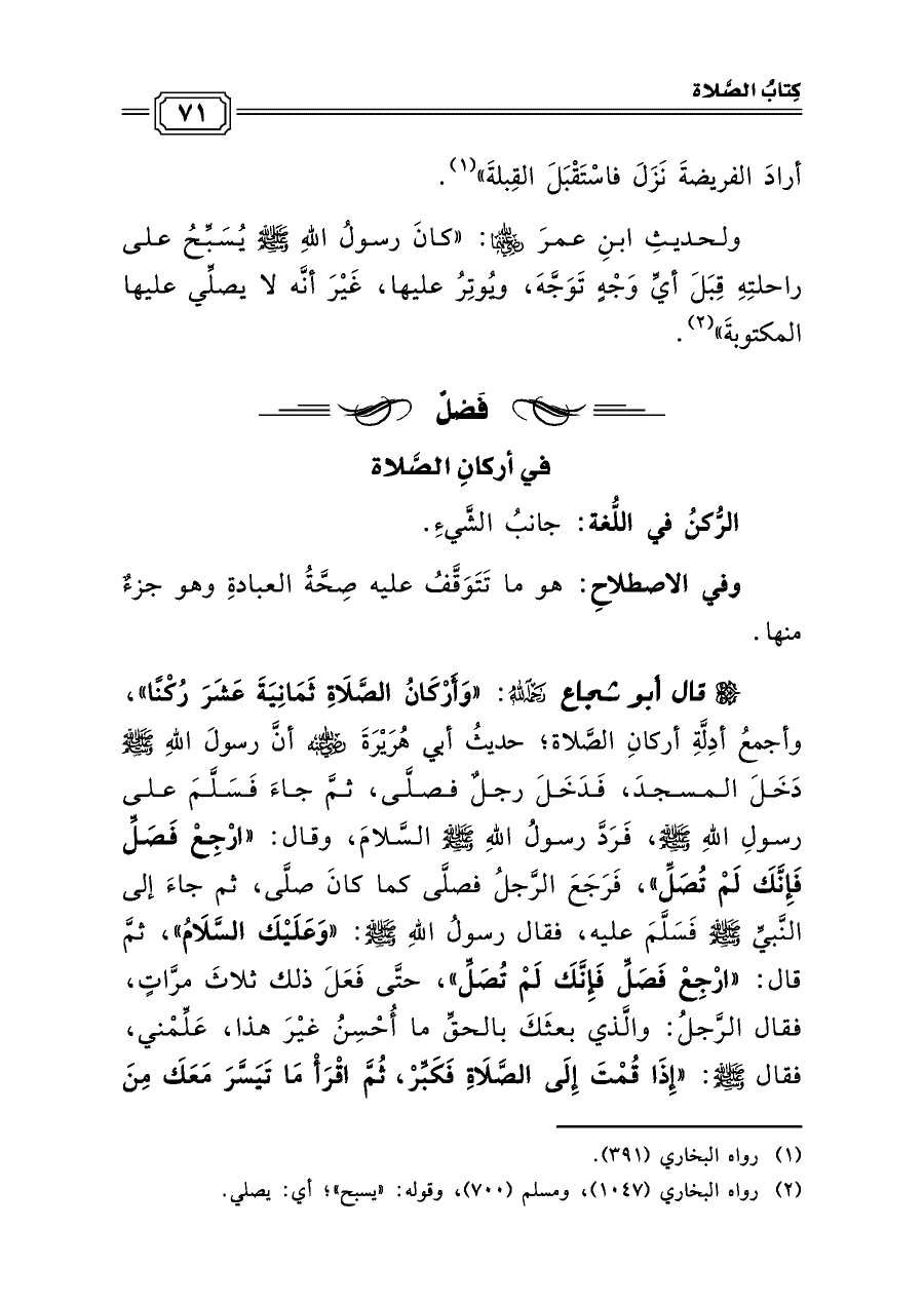 قال أبو شجاع رحمه الله: «وَأَرْكَانُ الصَّلَاةِ ثَمَانِيَةَ عَشَرَ رُكْنًا»، وأجمعُ أدِلَّةِ أركانِ الصَّلاة؛ حديثُ أبي هُرَيْرَةَ رضي الله عنه أنَّ رسولَ اللهِ صلى الله عليه وسلم دَخَلَ المسجدَ، فَدَخَلَ رجلٌ فصلَّى، ثمَّ جاءَ فَسَلَّمَ على رسولِ اللهِ صلى الله عليه وسلم، فَرَدَّ رسولُ اللهِ صلى الله عليه وسلم السَّلامَ، وقال: «ارْجِعْ فَصَلِّ فَإِنَّكَ لَمْ تُصَلِّ»، فَرَجَعَ الرَّجلُ فصلَّى كما كانَ صلَّى، ثم جاءَ إلى النَّبيِّ صلى الله عليه وسلم فَسَلَّمَ عليه، فقال رسولُ اللهِ صلى الله عليه وسلم: «وَعَلَيْكَ السَّلَامُ»، ثمَّ قال: «ارْجِعْ فَصَلِّ فَإِنَّكَ لَمْ تُصَلِّ»، حتَّى فَعَلَ ذلك ثلاثَ مرَّاتٍ، فقال الرَّجلُ: والَّذي بعثَكَ بالحقِّ ما أُحْسِنُ غيْرَ هذا، عَلِّمْني، فقال صلى الله عليه وسلم: «إِذَا قُمْتَ إِلَى الصَّلَاةِ فَكَبِّرْ، ثُمَّ اقْرَأْ مَا تَيَسَّرَ مَعَكَ مِنَ