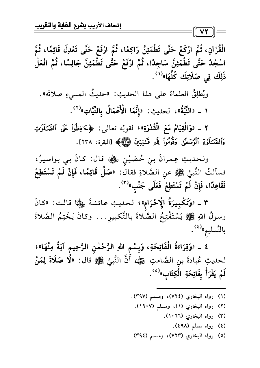 ولحديثِ عِمرانَ بنِ حُصَيْنٍ رضي الله عنه قال: كانَ بي بواسيرُ، فسألتُ النَّبيَّ صلى الله عليه وسلم عنِ الصَّلاةِ فقال: «صَلِّ قَائِمًا، فَإِنْ لَمْ تَسْتَطِعْ فَقَاعِدًا، فَإِنْ لَمْ تَسْتَطِعْ فَعَلَى جَنْبٍ» (¬٣).
