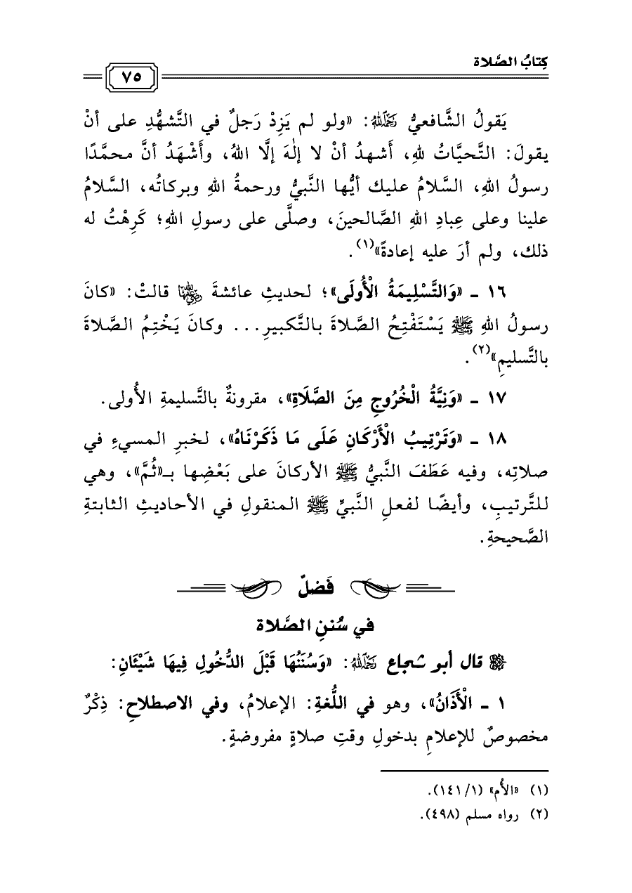١٦ - «وَالتَّسْلِيمَةُ الْأُولَى»؛ لحديثِ عائشةَ رضي الله عنها قالتْ: «كانَ رسولُ اللهِ صلى الله عليه وسلم يَسْتَفْتِحُ الصَّلاةَ بالتَّكبيرِ ... وكانَ يَخْتِمُ الصَّلاةَ بالتَّسليمِ» (¬٢).