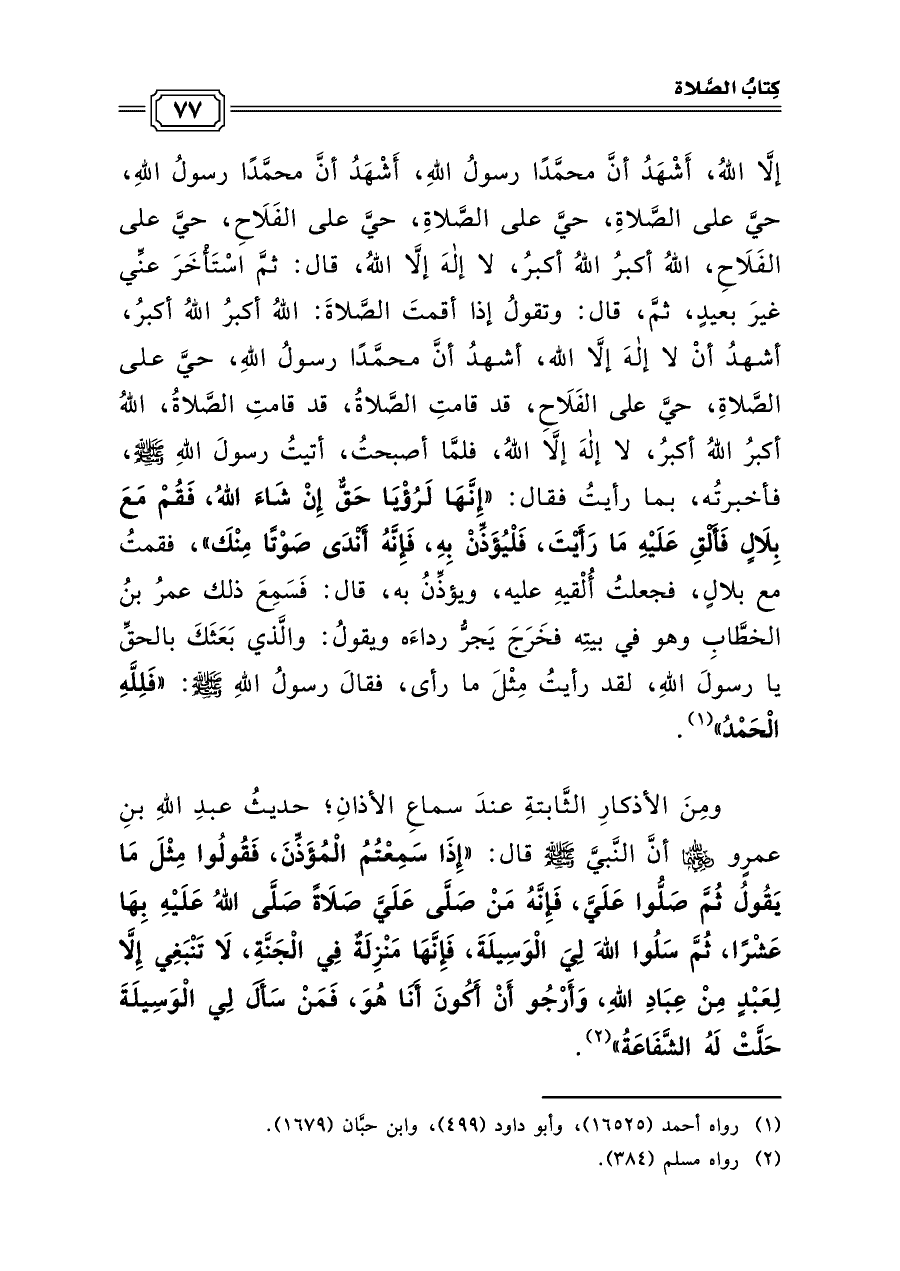 إلَّا اللهُ، أَشْهَدُ أنَّ محمَّدًا رسولُ اللهِ، أَشْهَدُ أنَّ محمَّدًا رسولُ اللهِ، حيَّ على الصَّلاةِ، حيَّ على الصَّلاةِ، حيَّ على الفَلَاحِ، حيَّ على الفَلَاحِ، اللهُ أكبرُ اللهُ أكبرُ، لا إلهَ إلَّا اللهُ، قال: ثمَّ اسْتَأْخَرَ عنِّي غيرَ بعيدٍ، ثمَّ، قال: وتقولُ إذا أقمتَ الصَّلاةَ: اللهُ أكبرُ اللهُ أكبرُ، أشهدُ أنْ لا إلهَ إلَّا الله، أشهدُ أنَّ محمَّدًا رسولُ اللهِ، حيَّ على الصَّلاةِ، حيَّ على الفَلَاحِ، قد قامتِ الصَّلاةُ، قد قامتِ الصَّلاةُ، اللهُ أكبرُ اللهُ أكبرُ، لا إلهَ إلَّا اللهُ، فلمَّا أصبحتُ، أتيتُ رسولَ اللهِ صلى الله عليه وسلم، فأخبرتُه، بما رأيتُ فقال: «إِنَّهَا لَرُؤْيَا حَقٌّ إِنْ شَاءَ اللهُ، فَقُمْ مَعَ بِلَالٍ فَأَلْقِ عَلَيْهِ مَا رَأَيْتَ، فَلْيُؤَذِّنْ بِهِ، فَإِنَّهُ أَنْدَى صَوْتًا مِنْكَ»، فقمتُ مع بلالٍ، فجعلتُ أُلْقيهِ عليه، ويؤذِّنُ به، قال: فَسَمِعَ ذلك عمرُ بنُ الخطَّابِ وهو في بيتِه فخَرَجَ يَجرُّ رداءَه ويقولُ: والَّذي بَعَثَكَ بالحقِّ يا رسولَ اللهِ، لقد رأيتُ مِثْلَ ما رأى، فقالَ رسولُ اللهِ صلى الله عليه وسلم: «فَلِلَّهِ الْحَمْدُ» (¬١).