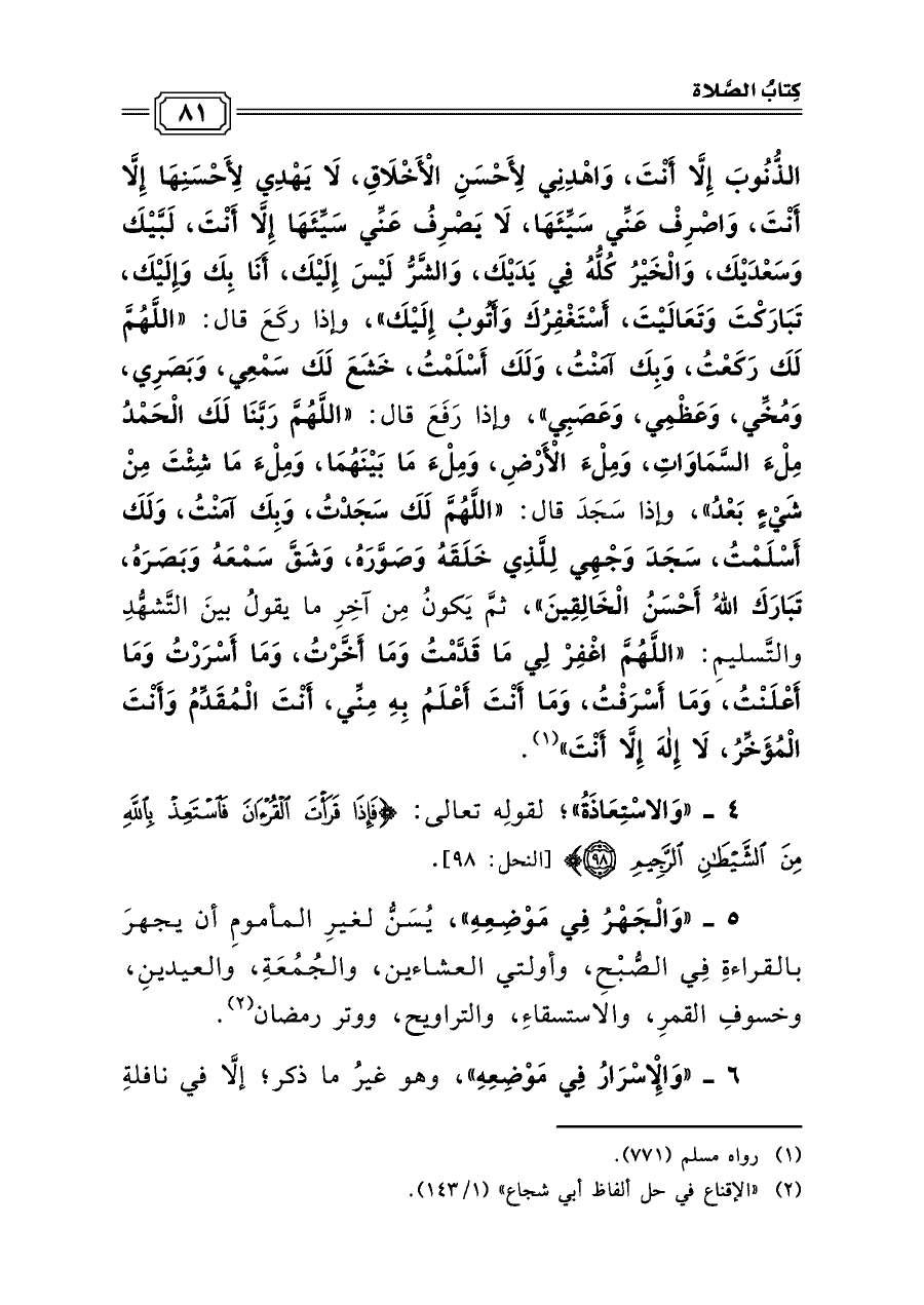 الذُّنُوبَ إِلَّا أَنْتَ، وَاهْدِنِي لِأَحْسَنِ الْأَخْلَاقِ، لَا يَهْدِي لِأَحْسَنِهَا إِلَّا أَنْتَ، وَاصْرِفْ عَنِّي سَيِّئَهَا، لَا يَصْرِفُ عَنِّي سَيِّئَهَا إِلَّا أَنْتَ، لَبَّيْكَ وَسَعْدَيْكَ، وَالْخَيْرُ كُلُّهُ فِي يَدَيْكَ، وَالشَّرُّ لَيْسَ إِلَيْكَ، أَنَا بِكَ وَإِلَيْكَ، تَبَارَكْتَ وَتَعَالَيْتَ، أَسْتَغْفِرُكَ وَأَتُوبُ إِلَيْكَ»، وإذا ركَعَ قال: «اللهُمَّ لَكَ رَكَعْتُ، وَبِكَ آمَنْتُ، وَلَكَ أَسْلَمْتُ، خَشَعَ لَكَ سَمْعِي، وَبَصَرِي، وَمُخِّي، وَعَظْمِي، وَعَصَبِي»، وإذا رَفَعَ قال: «اللهُمَّ رَبَّنَا لَكَ الْحَمْدُ مِلْءَ السَّمَاوَاتِ، وَمِلْءَ الْأَرْضِ، وَمِلْءَ مَا بَيْنَهُمَا، وَمِلْءَ مَا شِئْتَ مِنْ شَيْءٍ بَعْدُ»، وإذا سَجَدَ قال: «اللهُمَّ لَكَ سَجَدْتُ، وَبِكَ آمَنْتُ، وَلَكَ أَسْلَمْتُ، سَجَدَ وَجْهِي لِلَّذِي خَلَقَهُ وَصَوَّرَهُ، وَشَقَّ سَمْعَهُ وَبَصَرَهُ، تَبَارَكَ اللهُ أَحْسَنُ الْخَالِقِينَ»، ثمَّ يَكونُ مِن آخِرِ ما يقولُ بينَ التَّشهُّدِ والتَّسليمِ: