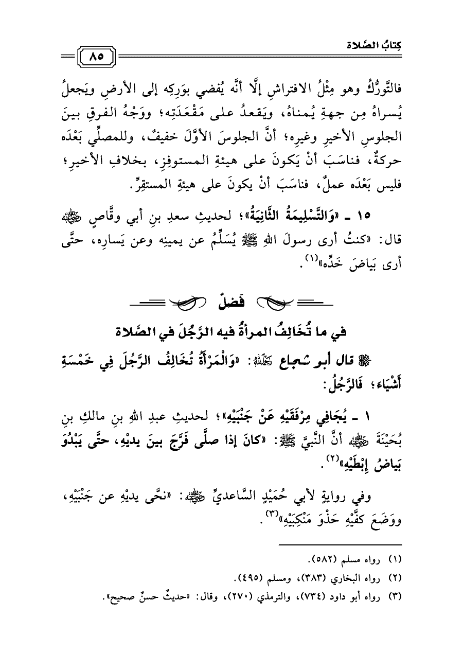 ١٥ - «وَالتَّسْلِيمَةُ الثَّانِيَةُ»؛ لحديثِ سعدِ بنِ أبي وقَّاصٍ رضي الله عنه قال: «كنتُ أرى رسولَ اللهِ صلى الله عليه وسلم يُسَلِّمُ عن يمينِه وعن يَسارِه، حتَّى أرى بَياضَ خَدِّه» (¬١).