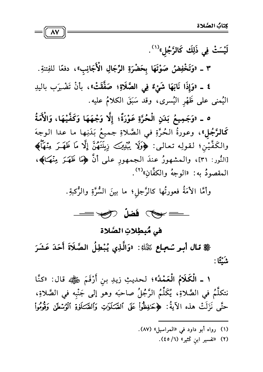 ١ - الْكَلَامُ الْعَمْدُ»؛ لحديثِ زيدِ بنِ أَرْقَمَ رضي الله عنه قال: «كنَّا نتكلَّمُ في الصَّلاةِ، يُكَلِّمُ الرَّجُلُ صاحبَه وهو إلى جَنْبِه في الصَّلاةِ، حتَّى نَزَلَتْ هذه الآيةُ: {حَافِظُوا عَلَى الصَّلَوَاتِ وَالصَّلَاةِ الْوُسْطَى وَقُومُوا