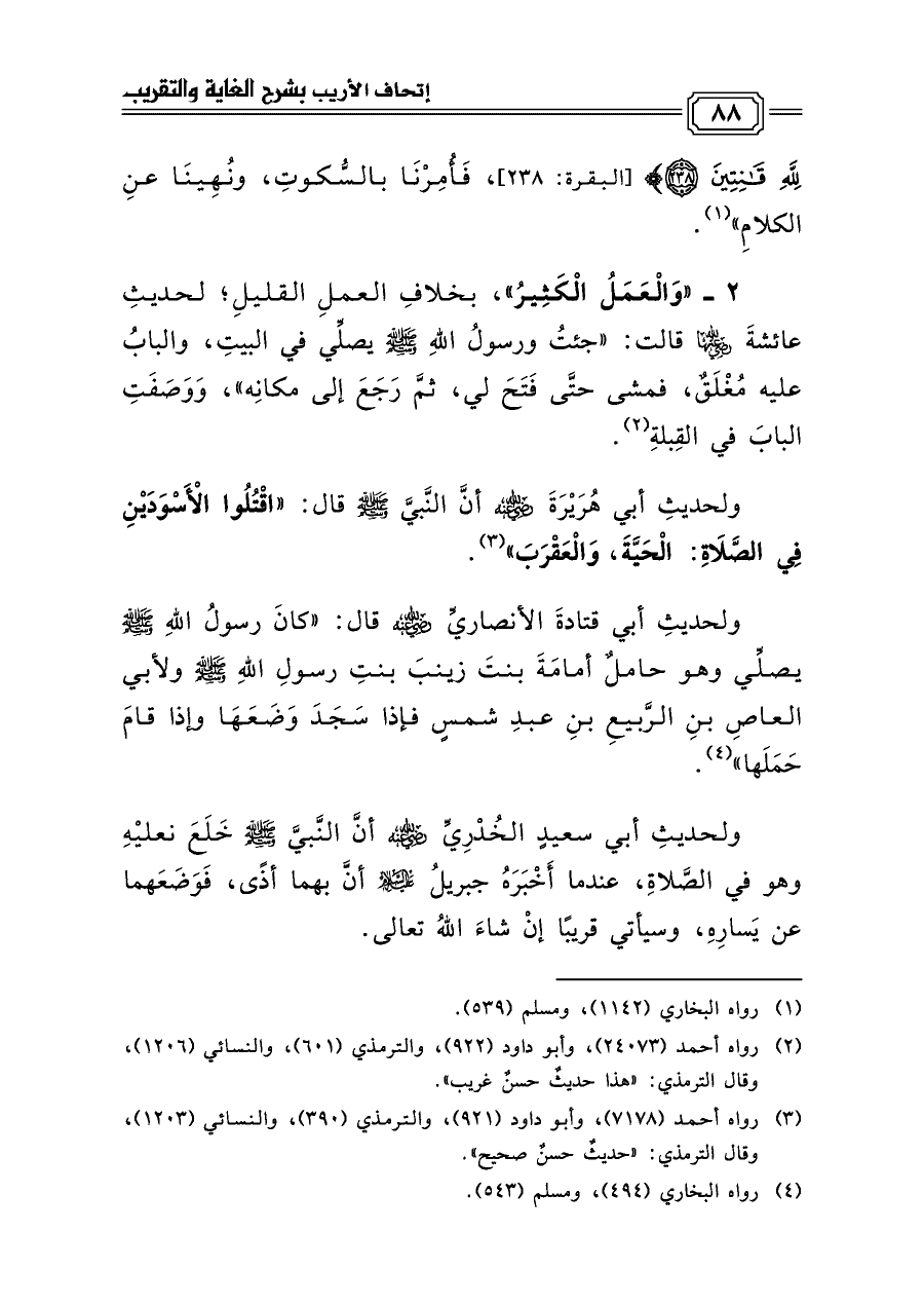 ٢ - «وَالْعَمَلُ الْكَثِيرُ»، بخلافِ العملِ القليلِ؛ لحديثِ عائشةَ رضي الله عنها قالت: «جئتُ ورسولُ اللهِ صلى الله عليه وسلم يصلِّي في البيتِ، والبابُ عليه مُغْلَقٌ، فمشى حتَّى فَتَحَ لي، ثمَّ رَجَعَ إلى مكانِه»، وَوَصَفَتِ البابَ في القِبلةِ (¬٢).