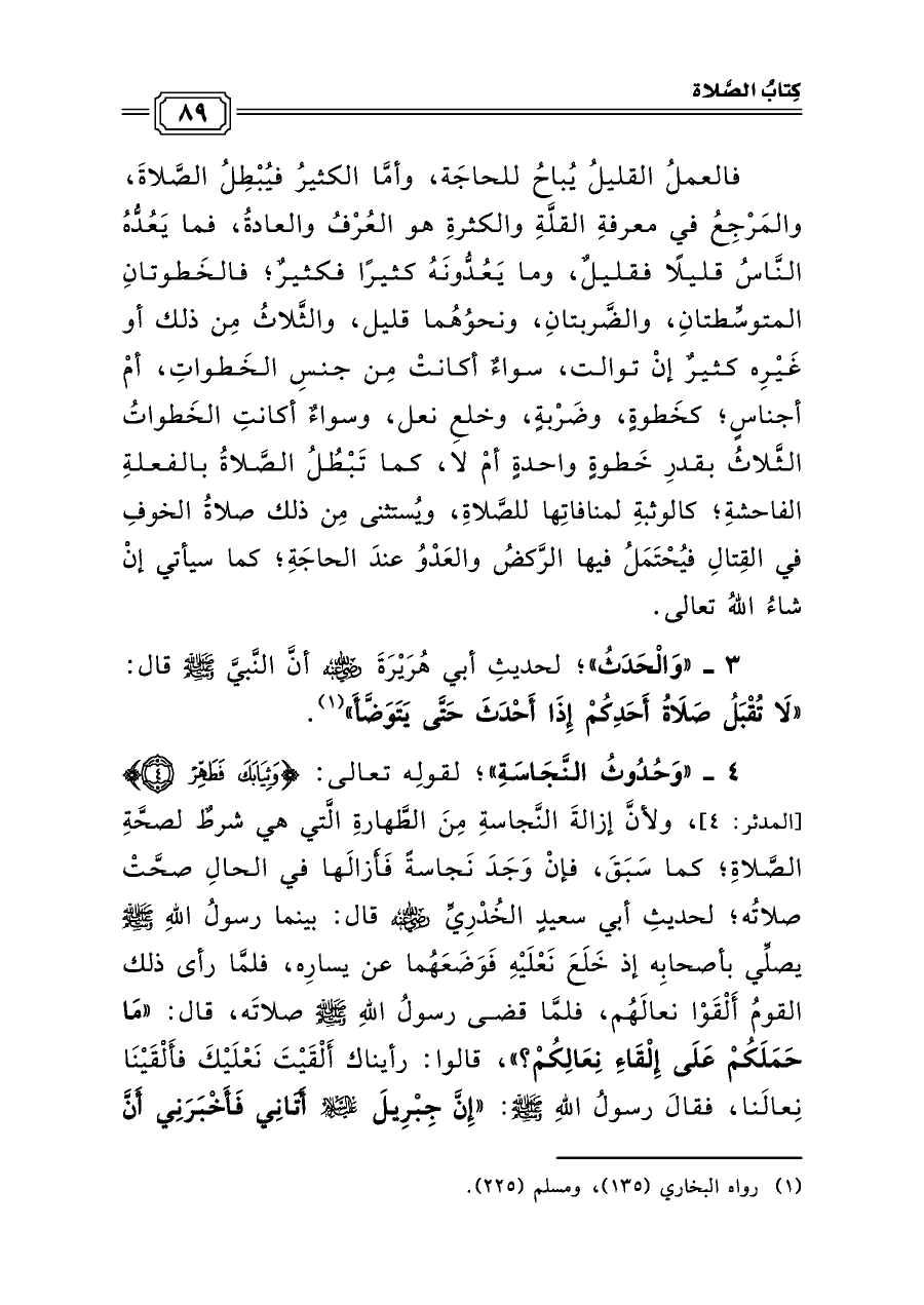 ٤ - «وَحُدُوثُ النَّجَاسَةِ»؛ لقولِه تعالى: {وَثِيَابَكَ فَطَهِّرْ} [المدثر: ٤]، ولأنَّ إزالةَ النَّجاسةِ مِنَ الطَّهارةِ الَّتي هي شرطٌ لصحَّةِ الصَّلاةِ؛ كما سَبَقَ، فإنْ وَجَدَ نَجاسةً فَأَزالَها في الحالِ صحَّتْ صلاتُه؛ لحديثِ أبي سعيدٍ الخُدْرِيِّ رضي الله عنه قال: بينما رسولُ اللهِ صلى الله عليه وسلم يصلِّي بأصحابِه إذ خَلَعَ نَعْلَيْهِ فَوَضَعَهُما عن يسارِه، فلمَّا رأى ذلك القومُ أَلْقَوْا نعالَهُم، فلمَّا قضى رسولُ اللهِ صلى الله عليه وسلم صلاتَه، قال: «مَا حَمَلَكُمْ عَلَى إِلْقَاءِ نِعَالِكُمْ؟»، قالوا: رأيناك أَلْقَيْتَ نَعْلَيْكَ فأَلْقَيْنَا نِعالَنا، فقالَ رسولُ اللهِ صلى الله عليه وسلم: «إِنَّ جِبْرِيلَ - عليه السلام - أَتَانِي فَأَخْبَرَنِي أَنَّ