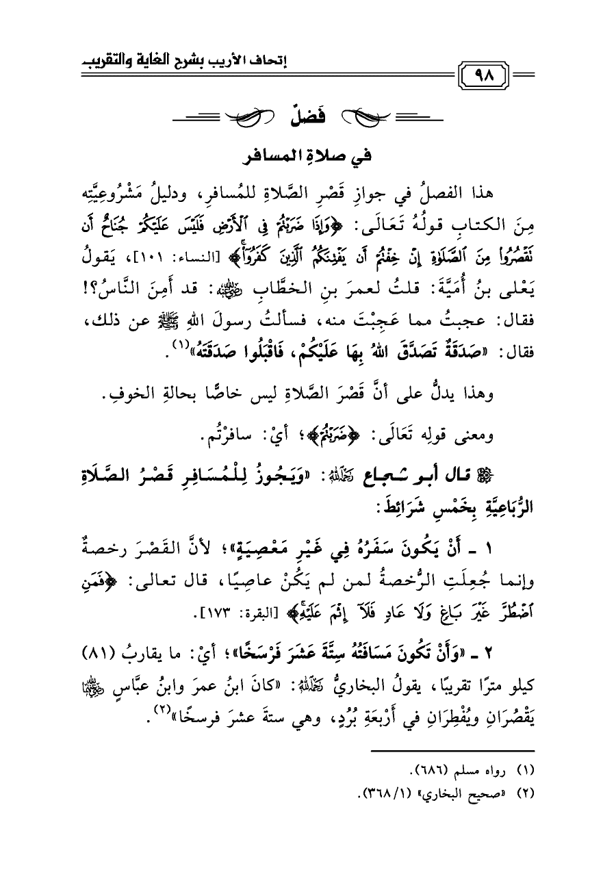 هذا الفصلُ في جوازِ قَصْرِ الصَّلاةِ للمُسافرِ، ودليلُ مَشْرُوعِيَّتِه مِنَ الكتابِ قولُهُ تَعَالَى: {وَإِذَا ضَرَبْتُمْ فِي الْأَرْضِ فَلَيْسَ عَلَيْكُمْ جُنَاحٌ أَنْ تَقْصُرُوا مِنَ الصَّلَاةِ إِنْ خِفْتُمْ أَنْ يَفْتِنَكُمُ الَّذِينَ كَفَرُوا} [النساء: ١٠١]، يَقولُ يَعْلى بنُ أُمَيَّةَ: قلتُ لعمرَ بنِ الخطَّابِ رضي الله عنه: قد أَمِنَ النَّاسُ؟! فقال: عجبتُ مما عَجِبْتَ منه، فسألتُ رسولَ اللهِ صلى الله عليه وسلم عن ذلك، فقال: «صَدَقَةٌ تَصَدَّقَ اللهُ بِهَا عَلَيْكُمْ، فَاقْبَلُوا صَدَقَتَهُ» (¬١).
