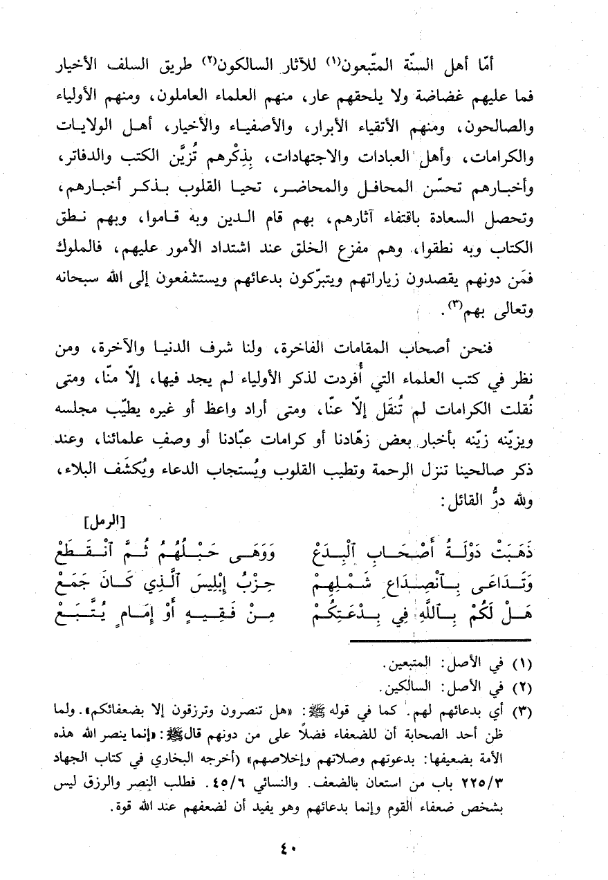 أما أهل السّنة المتبعون للآثار السالكون طَرِيق السّلف الأخيار فَمَا عَلَيْهِم غَضَاضَة وَلَا يلحقهم عَار مِنْهُم الْعلمَاء الْعَامِلُونَ وَمِنْهُم الْأَوْلِيَاء والصالحون وَمِنْهُم الأتقياء الْأَبْرَار والأصفياء والأخيار أهل الولايات والكرامات وَأهل الْعِبَادَات والاجتهادات بذكرهم تزين الْكتب والدفاتر وأخبارهم تحسن المحافل والمحاضر تحيا الْقُلُوب بِذكر أخبارهم وَتحصل السَّعَادَة باقتفاء آثَارهم بهم قَامَ الدّين وَبِه قَامُوا وبهم نطق الْكتاب وَبِه نطقوا وهم مفزع الْخلق عِنْد اشتداد الْأُمُور عَلَيْهِم فالملوك فَمن دونهم يقصدون زياراتهم ويتبركون بدعائهم ويستشفعون إِلَى الله سُبْحَانَهُ وَتَعَالَى بهم