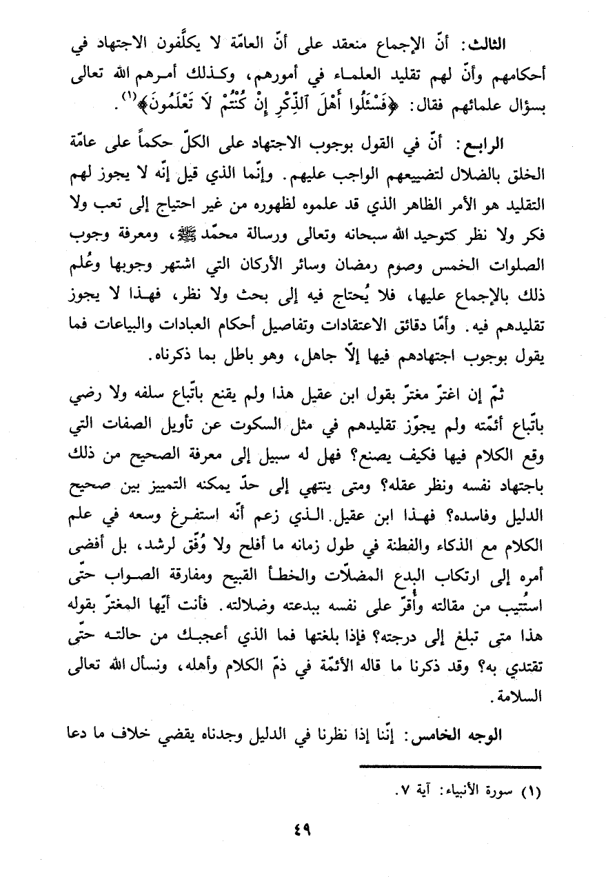الثَّالِث أَن الْإِجْمَاع مُنْعَقد على أَن الْعَامَّة لَا يكلفون الِاجْتِهَاد فِي أحكامهم وَأَن لَهُم تَقْلِيد الْعلمَاء فِي أُمُورهم وَكَذَلِكَ أَمرهم الله تَعَالَى بسؤال عُلَمَائهمْ فَقَالَ {فاسألوا أهل الذّكر إِن كُنْتُم لَا تعلمُونَ}