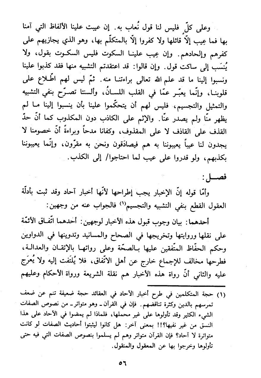 وَأما قَوْله إِن الْإِخْبَار يجب إطراحها لِأَنَّهَا أَخْبَار آحَاد وَقد ثَبت بأدلة الْعُقُول الْقطع بِنَفْي التَّشْبِيه والتجسيم فَالْجَوَاب عَنهُ من وَجْهَيْن