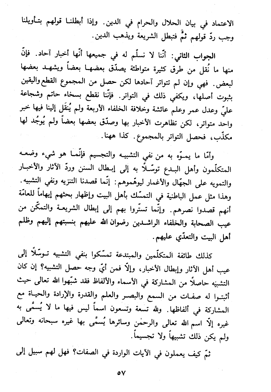كَذَلِك طَائِفَة الْمُتَكَلِّمين والمبتدعة تمسكوا بِنَفْي التَّشْبِيه توسلا إِلَى عيب أهل الْآثَار وَإِبْطَال الْأَخْبَار وَإِلَّا فَمن أَي وَجه حصل التَّشْبِيه إِن كَانَ التَّشْبِيه حَاصِلا من الْمُشَاركَة فِي الْأَسْمَاء والألفاظ فقد شبهوا الله تَعَالَى حَيْثُ أثبتوا لَهُ صِفَات من السّمع وَالْبَصَر وَالْعلم وَالْقُدْرَة والإرادة والحياة مَعَ الْمُشَاركَة فِي ألفاظها