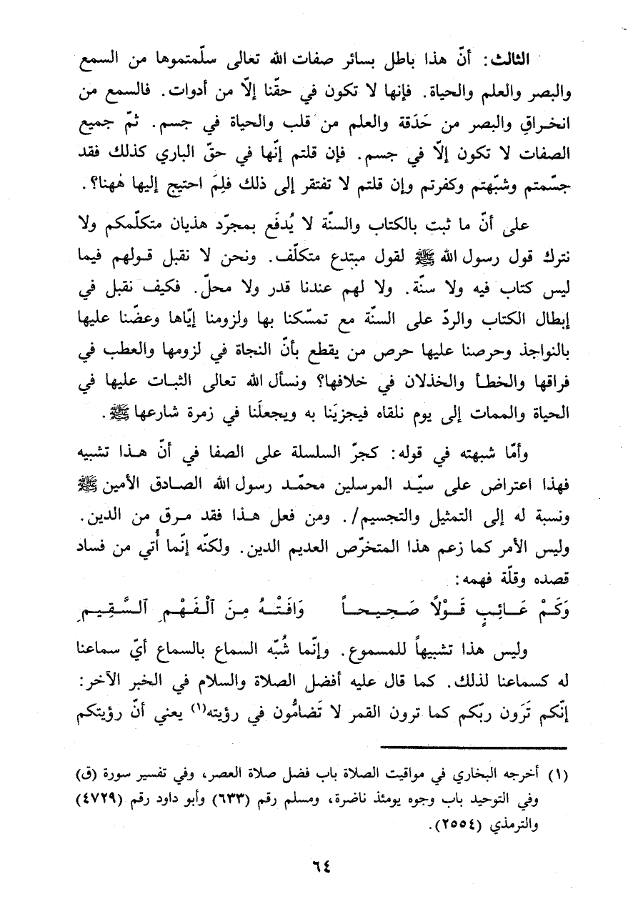 وَأما شبهتة فِي قَوْله كجر السلسلة على الصَّفَا فِي أَن هَذَا تَشْبِيه فَهَذَا اعْتِرَاض على سيد الْمُرْسلين مُحَمَّد رَسُول الله الصَّادِق الْأمين صلى الله عَلَيْهِ وَسلم وَنسبَة لَهُ إِلَى التَّمْثِيل والتجسيم