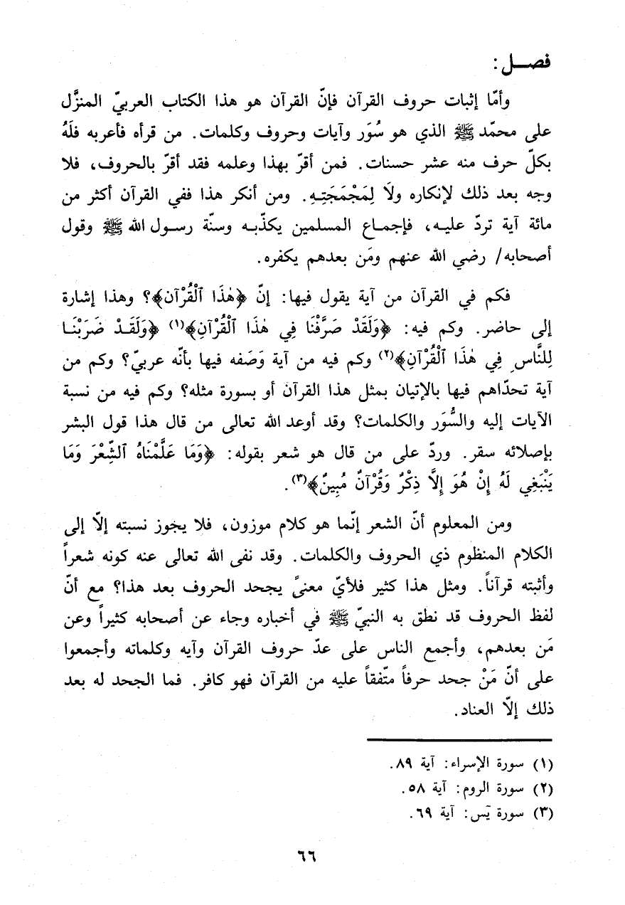 وَأما إِثْبَات حُرُوف الْقُرْآن فَإِن الْقُرْآن هُوَ هَذَا الْكتاب الْعَرَبِيّ الْمنزل على مُحَمَّد صلى الله عَلَيْهِ وَسلم الَّذِي هُوَ سور وآيات وحروف وكلمات
