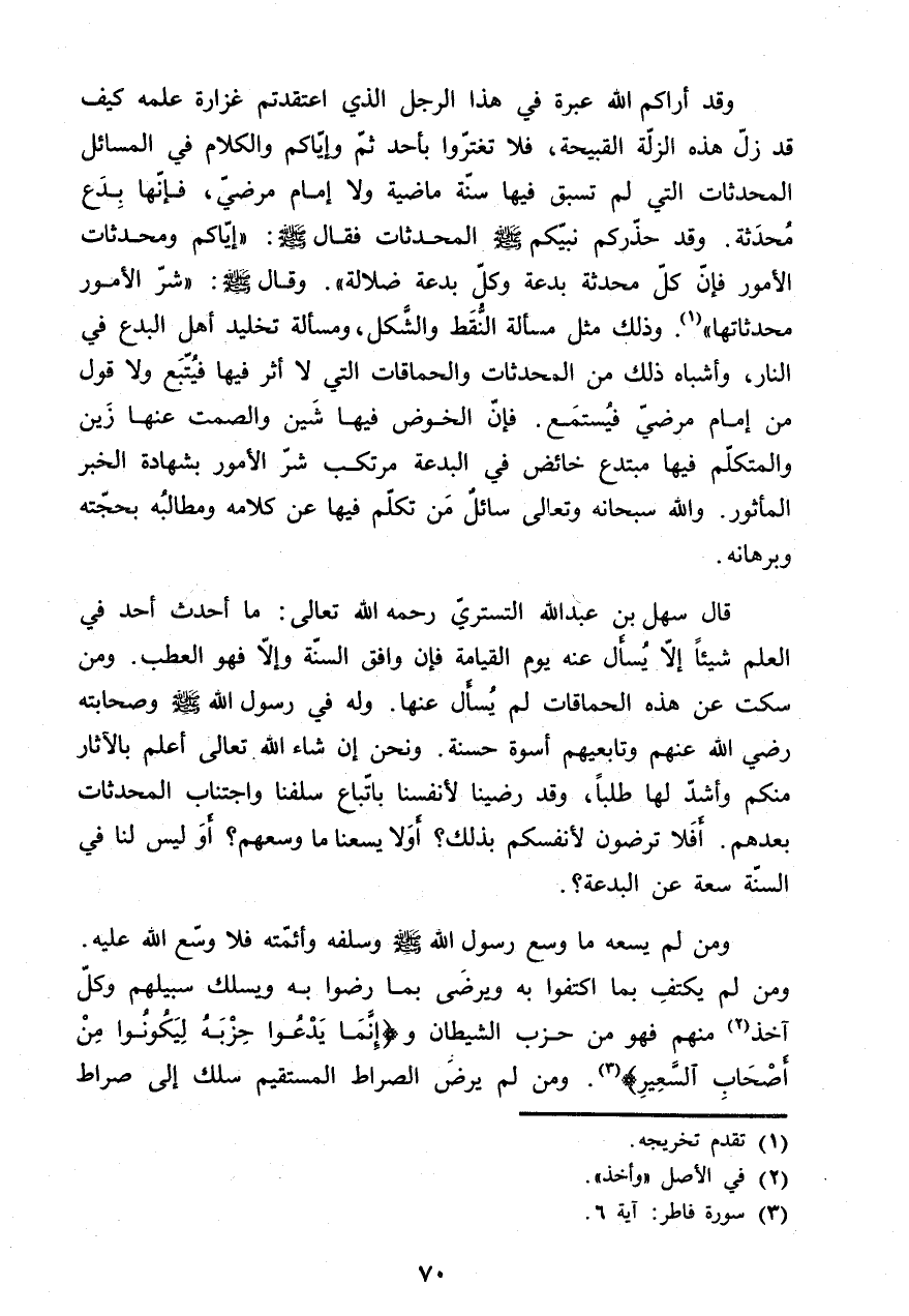 وَقد أَرَاكُم الله عِبْرَة فِي هَذَا الرجل الَّذِي اعتقدتم غزارة علمه كَيفَ قد زل هَذِه الزلة القبيحة فَلَا تغتروا بِأحد ثمَّ وَإِيَّاكُم وَالْكَلَام فِي الْمسَائِل المحدثات الَّتِي لم تسبق فِيهَا سنة مَاضِيَة وَلَا إِمَام مرضِي فَإِنَّهَا بدع محدثة