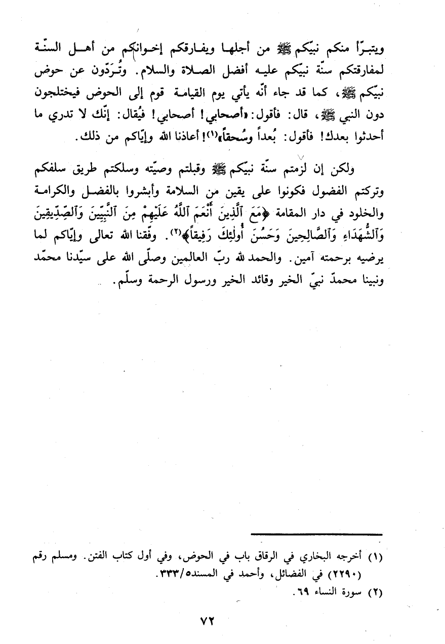 وَلَكِن إِن لزمتم سنة نَبِيكُم صلى الله عَلَيْهِ وَسلم وقبلتم وَصيته وسلكتم طَرِيق سلفكم وتركتم الفضول فكونوا على يَقِين من السَّلامَة وَأَبْشِرُوا بِالْفَضْلِ والكرامة وَالْخُلُود فِي دَار المقامة {مَعَ الَّذين أنعم الله عَلَيْهِم من النَّبِيين وَالصديقين وَالشُّهَدَاء وَالصَّالِحِينَ وَحسن أُولَئِكَ رَفِيقًا}