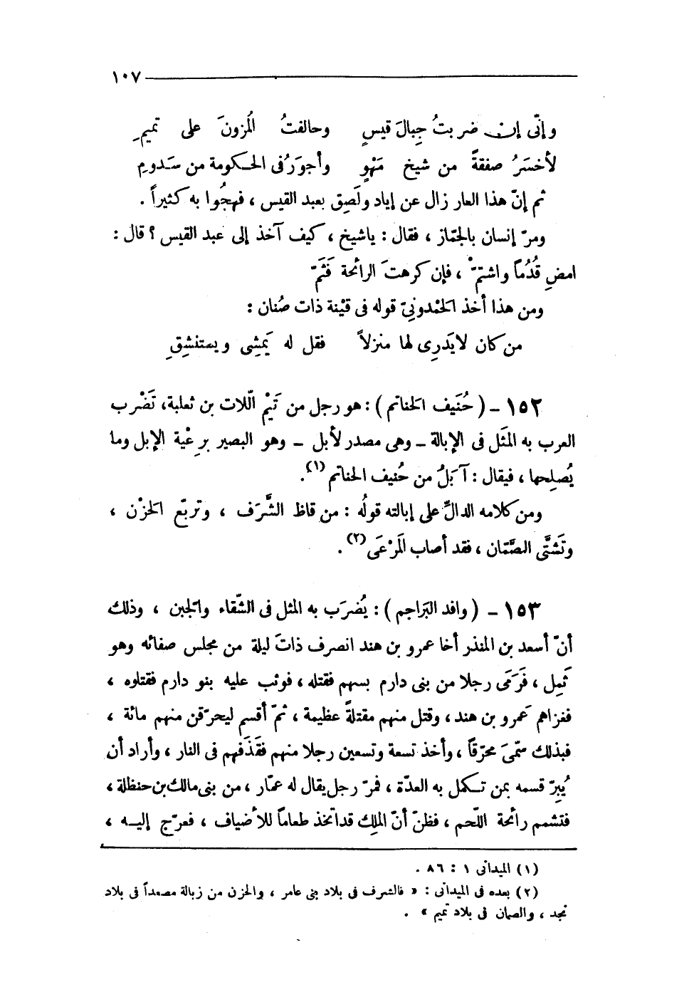 153 - (وَافد البراجم) يضْرب بِهِ الْمثل فِي الشَّقَاء والجبن وَذَلِكَ أَن أسعد بن الْمُنْذر أَخا عَمْرو بن هِنْد انْصَرف ذَات لَيْلَة من مجْلِس صفائه وَهُوَ ثمل فَرمى رجلا من بنى دارم بِسَهْم فَقتله فَوَثَبَ عَلَيْهِ بَنو دارم فَقَتَلُوهُ فغزاهم عَمْرو بن هِنْد وَقتل مِنْهُم مقتلة عَظِيمَة ثمَّ أقسم ليحرقن مِنْهُم مائَة فبذلك سمى محرقا وَأخذ تِسْعَة وَتِسْعين رجلا مِنْهُم فقذفهم فِي النَّار واراد ان يبر قسمه بِمن تكمل بِهِ الْعدة فَمر رجل يُقَال لَهُ عمار من بنى مَالك بن حَنْظَلَة فتشمم رَائِحَة اللَّحْم فَظن أَن الْملك قد اتخذ طَعَاما للأضياف فعرج إِلَيْهِ