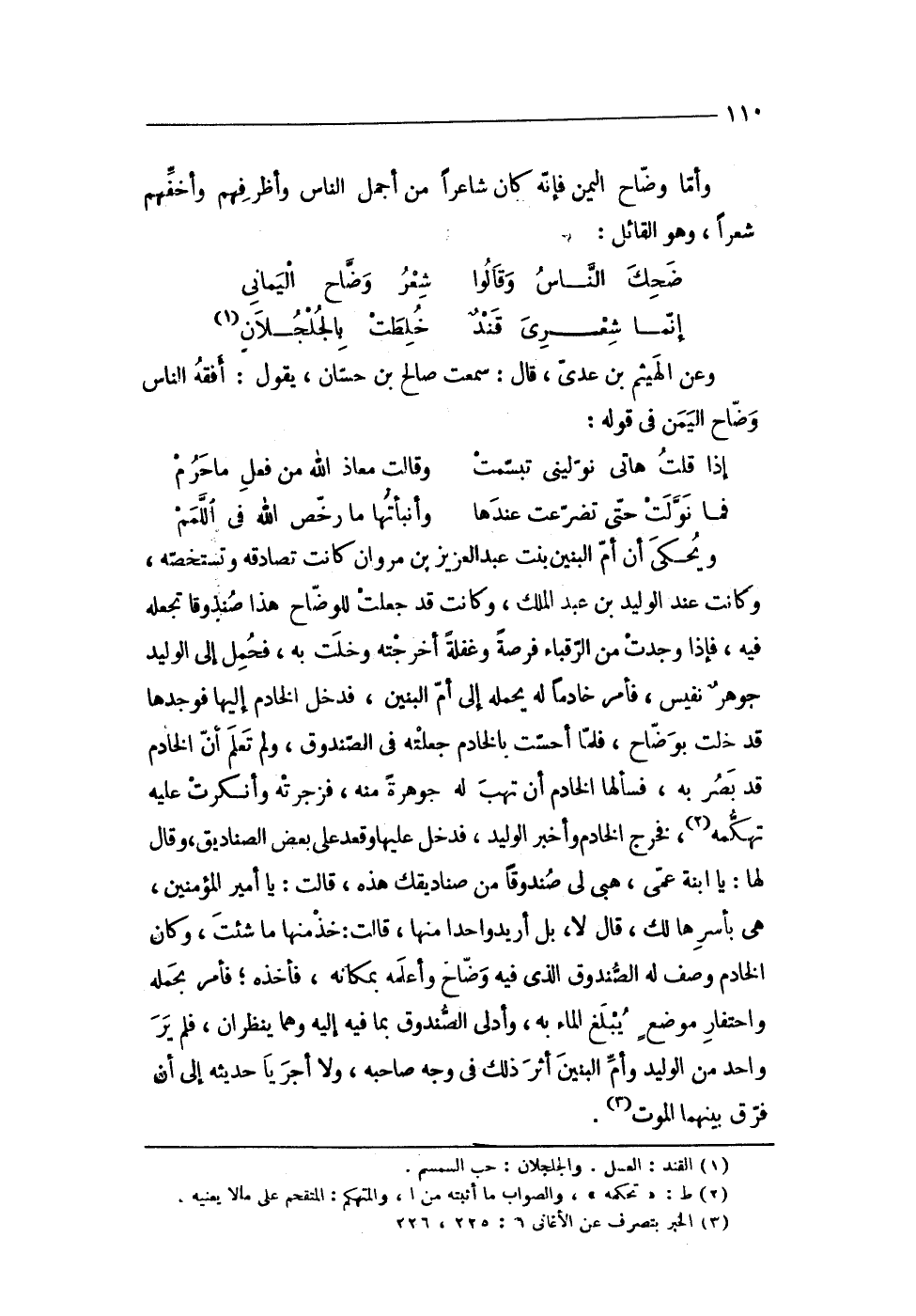 ويحكى أَن أم الْبَنِينَ بنت عبد الْعَزِيز بن مَرْوَان كَانَت تصادقه وتستخصه وَكَانَت عِنْد الْوَلِيد بن عبد الْملك وَكَانَت قد جعلت للوضاح هَذَا صندوقا تَجْعَلهُ فِيهِ فَإِذا وجدت من الرقباء فرْصَة وغفلة أخرجته وخلت بِهِ فَحمل إِلَى الْوَلِيد جَوْهَر نَفِيس فَأمر خَادِمًا لَهُ يحملهُ إِلَى أم الْبَنِينَ فَدخل الْخَادِم إِلَيْهَا فَوَجَدَهَا قد خلت بوضاح فَلَمَّا أحست بالخادم جعلته فِي الصندوق وَلم تعلم أَن الْخَادِم قد بصر بِهِ فَسَأَلَهَا الْخَادِم أَن تهب لَهُ جَوْهَرَة مِنْهُ فزجرته وَأنْكرت عَلَيْهِ تهكمه فَخرج الْخَادِم وَأخْبر الْوَلِيد فَدخل عَلَيْهَا وَقعد على بعض الصناديق وَقَالَ لَهَا يَا ابْنة عمى هبى لى صندوقا من صناديقك هَذِه قَالَت يَا أَمِير الْمُؤمنِينَ هى بأسرها لَك قَالَ لَا بل أُرِيد وَاحِدًا مِنْهَا قَالَت خُذ مِنْهَا مَا شِئْت وَكَانَ الْخَادِم وصف لَهُ الصندوق الذى فِيهِ وضاح وأعلمه بمكانه فَأَخذه فَأمر بِحمْلِهِ واحتفار مَوضِع يبلغ المَاء بِهِ وأدلى الصندوق بِمَا فِيهِ إِلَيْهِ وهما ينْظرَانِ فَلم ير وَاحِد من الْوَلِيد وَأم الْبَنِينَ أثر ذَلِك فِي وَجه صَاحبه وَلَا أجريا حَدِيثه إِلَى أَن فرق بَينهمَا الْمَوْت