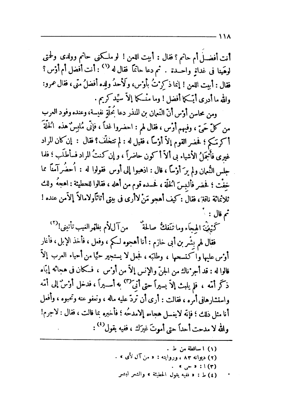 وَمن محَاسِن أَوْس أَن النُّعْمَان بن الْمُنْذر دَعَا بحلة نفيسة وَعِنْده وُفُود الْعَرَب من كل حى وَفِيهِمْ أَوْس فَقَالَ لَهُم احضروا غَدا فإنى ملبس هَذِه الْحلَّة أكْرمكُم فَحَضَرَ الْقَوْم إِلَّا أَوْسًا فَقيل لَهُ لم تتخلف فَقَالَ إِن كَانَ المُرَاد غيرى فأجمل الْأَشْيَاء بى أَلا أكون حَاضرا وَإِن كنت المُرَاد فسأطلب فَلَمَّا جلس النُّعْمَان وَلم ير أَوْسًا قَالَ اذْهَبُوا إِلَى أَوْس فَقولُوا لَهُ احضر آمنا مِمَّا خفت فَحَضَرَ فألبس الْحلَّة فحسده قوم من أَهله فَقَالُوا للحطيئة اهجه وَلَك ثَلَاثمِائَة نَاقَة فَقَالَ كَيفَ أهجو من لَا أرى فِي بيتى أثاثا وَلَا مَالا إِلَّا من عِنْده ثمَّ قَالَ