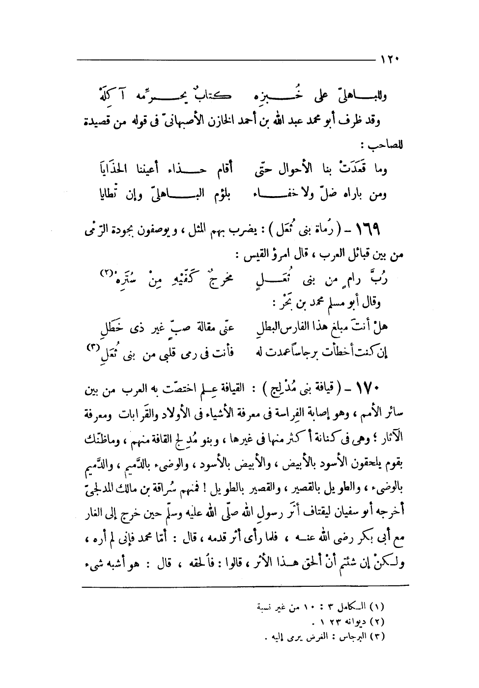 170 - (قيافة بنى مُدْلِج) القيافة علم اخْتصّت بِهِ الْعَرَب من بَين سَائِر الْأُمَم وَهُوَ إِصَابَة الفراسة فِي معرفَة الْأَشْيَاء فِي الْأَوْلَاد والقرابات وَمَعْرِفَة الْآثَار وهى فِي كنَانَة أَكثر مِنْهَا فِي غَيرهَا وَبَنُو مُدْلِج الْقَافة مِنْهُم وَمَا ظَنك بِقوم يلحقون الْأسود بالأبيض والأبيض بالأسود والوضئ بالدميم والدميم بالوضئ والطويل بالقصير والقصير بالطويل فَمنهمْ سراقَة بن مَالك المدلجى أخرجه أَبُو سُفْيَان ليقتاف أثر رَسُول الله صلى الله عَلَيْهِ وَسلم حِين خرج إِلَى الْغَار مَعَ أَبى بكر رَضِي الله عَنهُ فَلَمَّا رأى أثر قدمه قَالَ أما مُحَمَّد فإنى لم أره وَلَكِن إِن شِئْتُم أَن ألحق هَذَا الْأَثر قَالُوا فَالْحَقْهُ قَالَ هُوَ أشبه شَيْء
