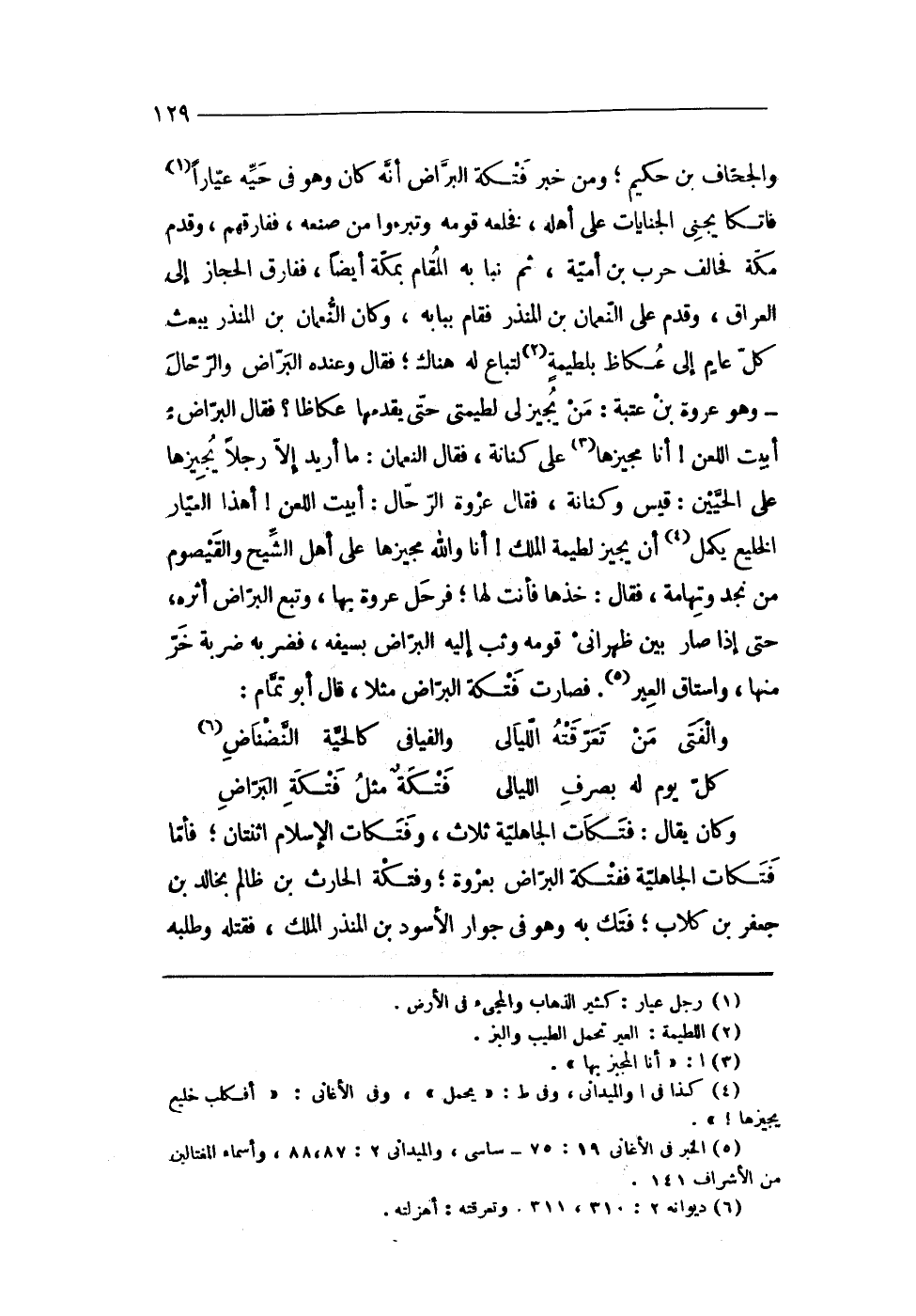 والجحاف بن حَكِيم وَمن خبر فتكه البراض أَنه كَانَ وَهُوَ فِي حيه عيارا فاتكا يجنى الْجِنَايَات على أَهله فخلعه قومه وتبرءوا من صنعه ففارقهم وَقدم مَكَّة مُخَالف حَرْب بن أُميَّة ثمَّ نبا بِهِ الْمقَام بِمَكَّة أَيْضا فَفَارَقَ الْحجاز إِلَى الْعرَاق وَقدم على النُّعْمَان بن المندر فَقَامَ بِبَابِهِ وَكَانَ النُّعْمَان بن الْمُنْذر يبْعَث كل عَام إِلَى عكاظ بلطيمة لتباع لَهُ هُنَاكَ فَقَالَ وَعِنْده البراض والرحال وَهُوَ عُرْوَة بن عتبَة من يُجِيز لى لطيمتى حَتَّى يقدمهَا عكاظ فَقَالَ البراض أَبيت اللَّعْن أَنا مجيزها على كنَانَة فَقَالَ النُّعْمَان مَا أُرِيد إِلَّا رجلا يجيزها على الْحَيَّيْنِ قيس وكنانة فَقَالَ عُرْوَة الرّحال أَبيت اللَّعْن أَهَذا الْعيار الخليع يكمل أَن يُجِيز لطيمة الْملك أَنا وَالله أجيزها على أهل الشَّيْخ والقيصوم من نجد وتهامة فَقَالَ خُذْهَا فَأَنت لَهَا فَرَحل عُرْوَة بهَا وَتبع البراض أَثَره حَتَّى إِذا صَار بَين ظهرانى قومه وثب إِلَيْهِ البراض بِسَيْفِهِ فَضَربهُ ضَرْبَة خر مِنْهَا وَاسْتَاقَ العير فَصَارَت فتكة البراض مثلا قَالَ أَبُو تَمام