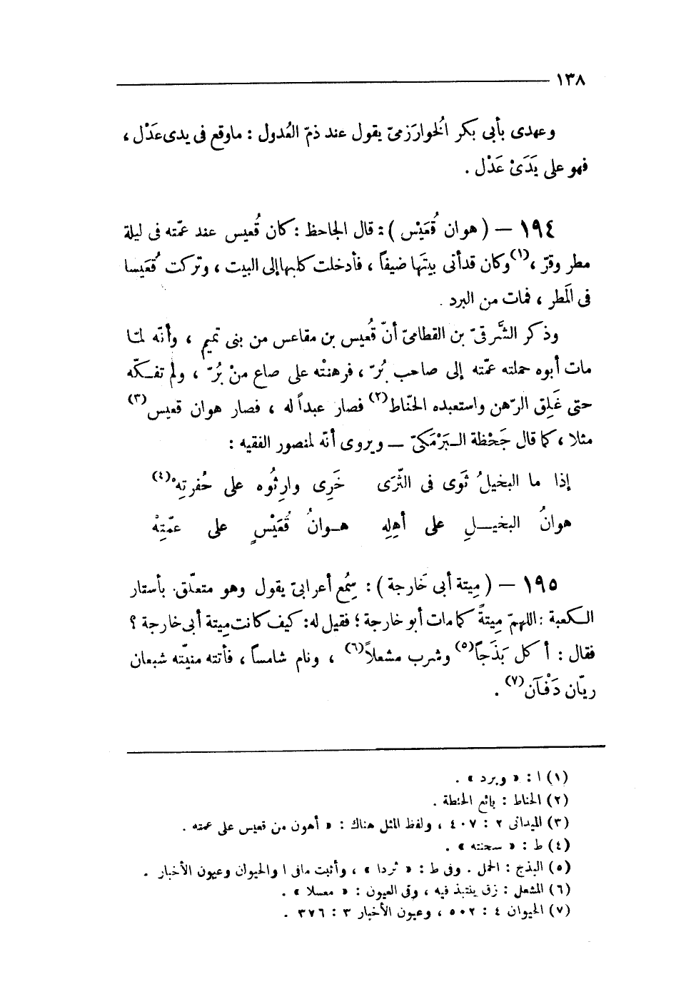 195 - (ميتَة أَبى خَارِجَة) سمع أعرابى يَقُول وَهُوَ مُتَعَلق بِأَسْتَارِ الْكَعْبَة اللَّهُمَّ ميتَة كَمَا مَاتَ أَبُو خَارِجَة فَقيل لَهُ كَيفَ كَانَت ميتَة أَبى خَارِجَة فَقَالَ أكل بذجا وَشرب مشعلا ونام شامسا فَأَتَتْهُ منيته شعْبَان رَيَّان دفآن