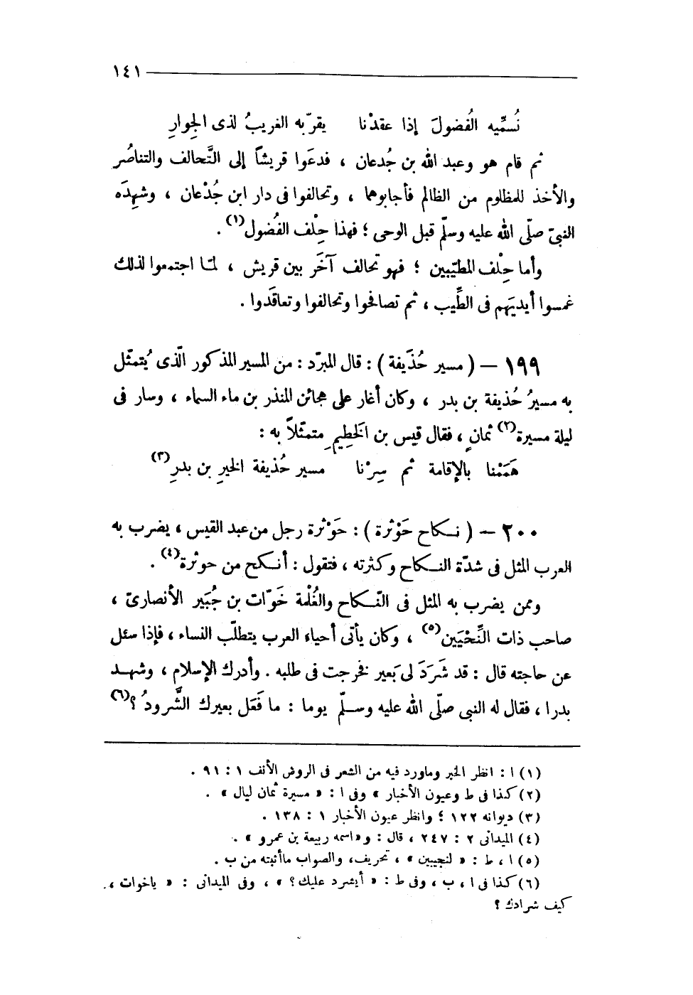 199 - مسير حُذَيْفَة قَالَ الْمبرد من الْمسير الْمَذْكُور الَّذِي يتَمَثَّل بِهِ مسير حُذَيْفَة بن بدر وَكَانَ أغار على هجائن الْمُنْذر بن مَاء السَّمَاء وَسَار فِي لَيْلَة مسيرَة ثَمَان فَقَالَ قيس بن الخطيم متمثلا بِهِ