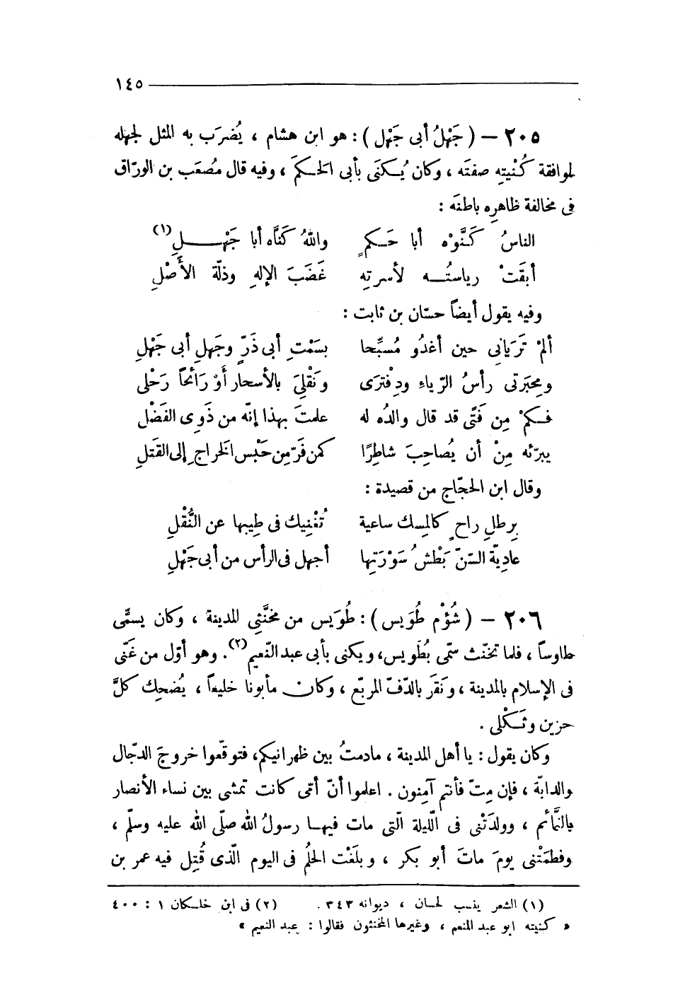 205 - (جهل أَبى جهل) هُوَ ابْن هِشَام يضْرب بِهِ الْمثل لجهله لموافقة كنيته صفته وَكَانَ يكنى بأبى الحكم وَفِيه قَالَ مُصعب بن الْوراق فِي مُخَالفَة ظَاهره بَاطِنه