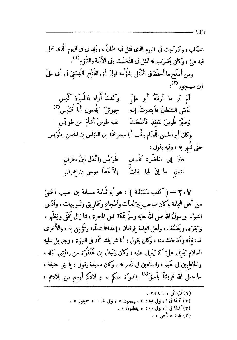 207 - (كذب مُسَيْلمَة) هُوَ أَبُو ثُمَامَة مُسَيْلمَة بن حبيب الحنفى من أهل الْيَمَامَة كَانَ صَاحب نيرنجات وأسجاع ومخاريق وتمويهات وأدعى النُّبُوَّة وَرَسُول الله صلى الله عَلَيْهِ وَسلم بِمَكَّة قبل الْهِجْرَة فَمَا زَالَ يخفى وَيظْهر ويقوى ويضعف وَأهل الْيَمَامَة فرقتان إِحْدَاهمَا تعظمه وتؤمن بِهِ وَالْأُخْرَى تستخفه وتضحك مِنْهُ وَكَانَ يَقُول أَنا شريك مُحَمَّد فِي النُّبُوَّة وَجِبْرِيل عَلَيْهِ السَّلَام ينزل على كَمَا ينزل عَلَيْهِ وَكَانَ رجال بن عنفوة من رائشى نبله والحاطبين فِي حبله والساعين فِي نصرته وَكَانَ مُسَيْلمَة يَقُول يَا بنى حنيفَة مَا جعل الله قُريْشًا بِأَحَق بِالنُّبُوَّةِ مِنْكُم وبلادكم أوسع من بِلَادهمْ