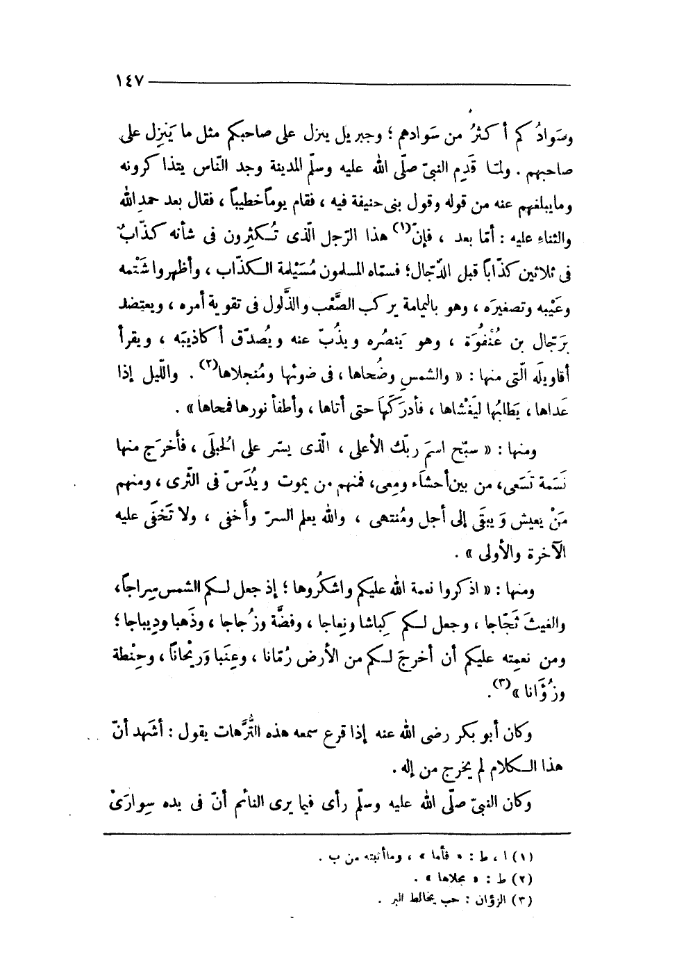 وسوادكم أَكثر من سوادهم وَجِبْرِيل ينزل على صَاحبكُم مثل مَا ينزل على صَاحبهمْ وَلما قدم النبى صلى الله عَلَيْهِ وَسلم الْمَدِينَة وجد النَّاس يتذاكرونه وَمَا يبلغهم عَنهُ من قَوْله وَقَول بنى حنيفَة فِيهِ فَقَامَ يَوْمًا خَطِيبًا فَقَالَ بعد حمد الله وَالثنَاء عَلَيْهِ أما بعد فَإِن هَذَا الرجل الذى تكثرون فِي شَأْنه كَذَّاب فى ثَلَاثِينَ كذابا قبل الدَّجَّال فَسَماهُ الْمُسلمُونَ مُسَيْلمَة الْكذَّاب وأظهروا شَتمه وعيبه وتصغيره وَهُوَ بِالْيَمَامَةِ يركب الصعب والذلول فِي تَقْوِيَة أمره ويعتضد بِرِجَال بن عنفوة وَهُوَ ينصره ويذب عَنهُ وَيصدق أكاذيبه وَيقْرَأ أقاويله الَّتِى مِنْهَا وَالشَّمْس وَضُحَاهَا فى ضوئها ومنجلاها وَاللَّيْل إِذا عَداهَا يطْلبهَا ليغشاها فأدركها حَتَّى أَتَاهَا وأطفأ نورها فمحاها