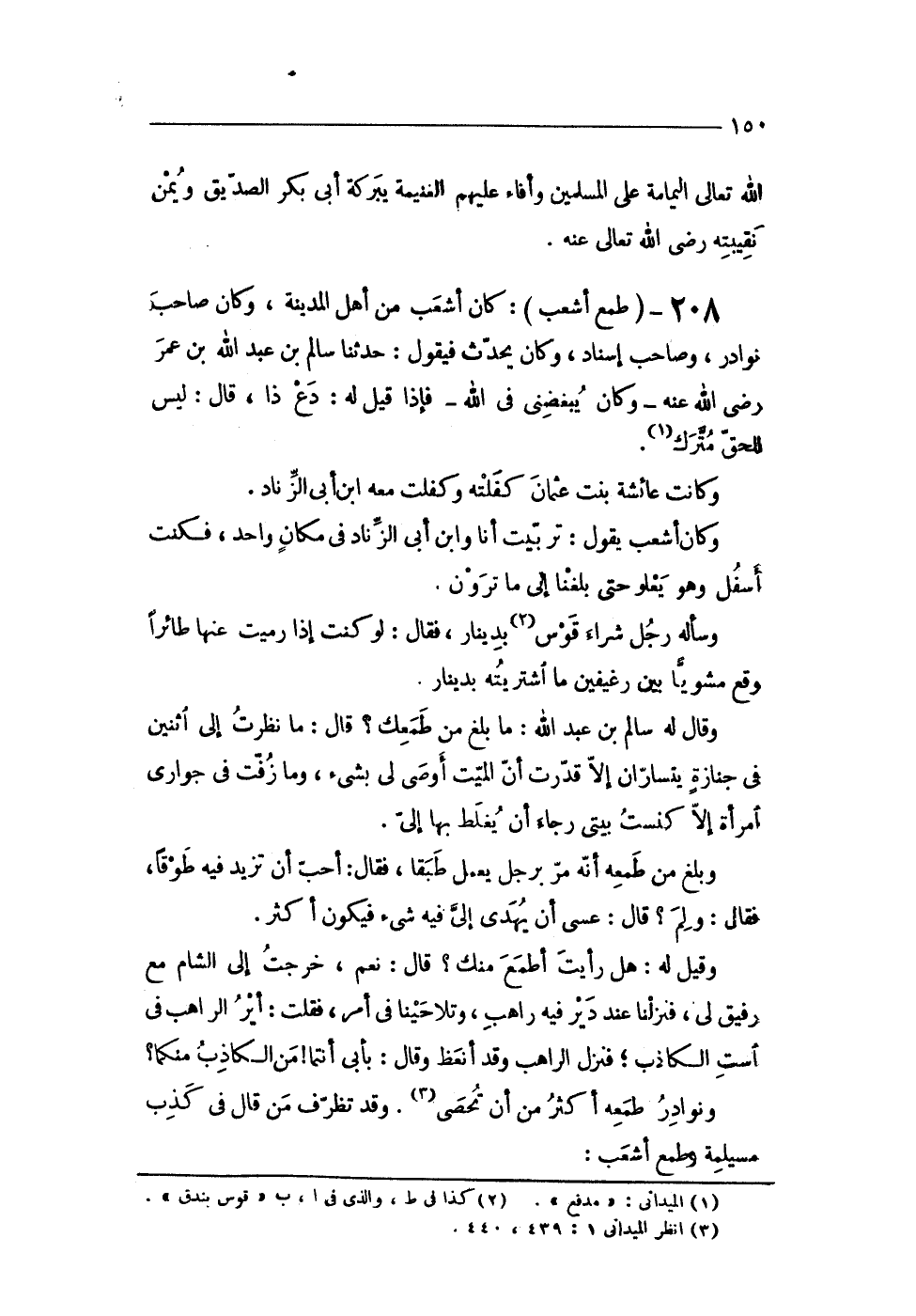208 - (طمع أشعب) كَانَ أشعب من أهل الْمَدِينَة وَكَانَ صَاحب نَوَادِر وَصَاحب إِسْنَاد وَكَانَ يحدث فَيَقُول حَدثنَا سَالم بن عبد الله بن عمر رضى الله عَنهُ وَكَانَ يبغضنى فى الله فَإِذا قيل لَهُ دع ذَا قَالَ لَيْسَ للحق مترك