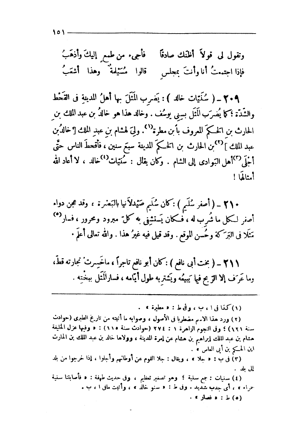 209 - (سنيات خَالِد) يضْرب الْمثل بهَا أهل الْمَدِينَة فى الْقَحْط والشدة كَمَا يضْرب الْمثل بسنى يُوسُف وخَالِد هَذَا هُوَ خَالِد بن عبد الْملك بن الْحَارِث بن الحكم الْمَعْرُوف بِابْن مطرة ولى لهشام بن عبد الْملك خَالِد بن عبد الْملك بن الْحَارِث بن الحكم الْمَدِينَة سبع سِنِين فأقحط النَّاس حَتَّى أجلى أهل البوادى إِلَى الشَّام وَكَانَ يُقَال سنيات خَالِد لَا أعَاد الله أَمْثَالهَا