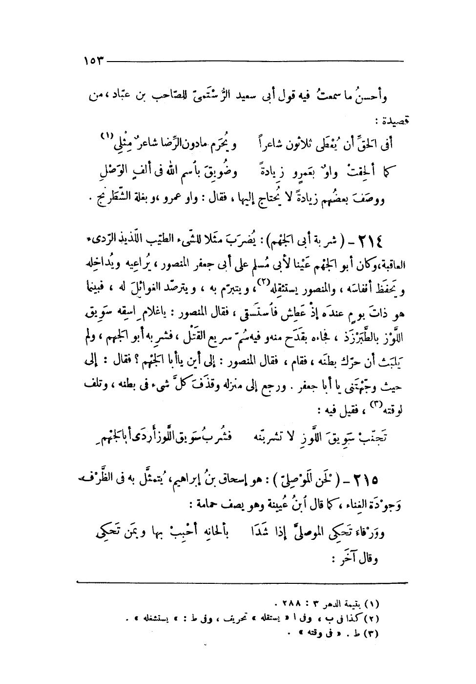 215 - (لحن الموصلى) هُوَ إِسْحَاق بن إِبْرَاهِيم يتَمَثَّل بِهِ فى الظّرْف وجودة الْغناء كَمَا قَالَ ابْن عُيَيْنَة وَهُوَ يصف حمامة