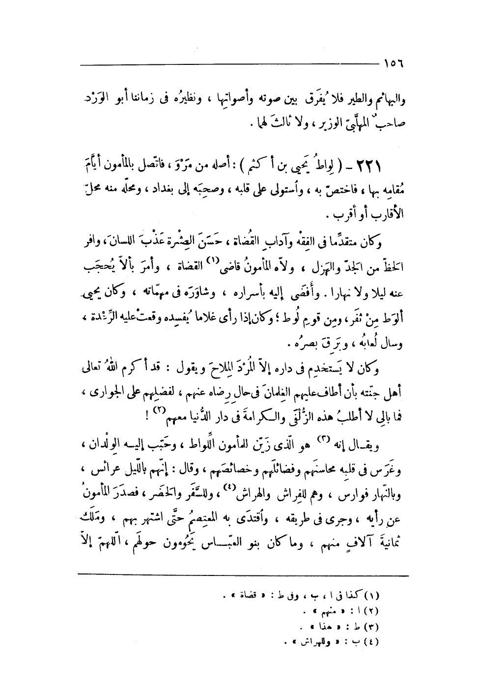وَكَانَ مُتَقَدما فى الْفِقْه وآداب الْقُضَاة حسن الْعشْرَة عذب اللِّسَان وافر الْحَظ من الْجد والهزل ولاه الْمَأْمُون قاضى الْقُضَاة وَأمر بألا يحجب عَنهُ لَيْلًا وَلَا نَهَارا وأفضى إِلَيْهِ بأسراره وشاوره فى مهماته وَكَانَ يحيى ألوط من ثفر وَمن قوم لوط وَكَانَ إِذا رأى غُلَاما يُفْسِدهُ وَقعت عَلَيْهِ الرعدة وسال لعابه وبرق بَصَره