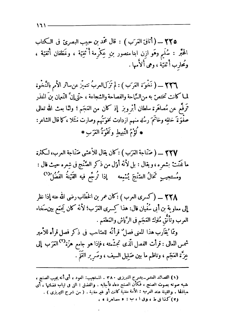 226 - (نخوة الْعَرَب) لم تزل الْعَرَب تتَمَيَّز عَن سَائِر الْأُمَم بالنخوة لما كَانَت تخْتَص بِهِ من السماحة والفصاحة والشجاعة حَتَّى إِن النُّعْمَان بن الْمُنْذر ترفع عَن مصاهرة سُلْطَان أبرويز إِذْ كَانَ من الْعَجم وَلما بعث الله تَعَالَى صفوة خلقه وَخَاتم رسله مِنْهُم ازدادت نخوتهم وَصَارَت مثلا كَمَا قَالَ الشَّاعِر