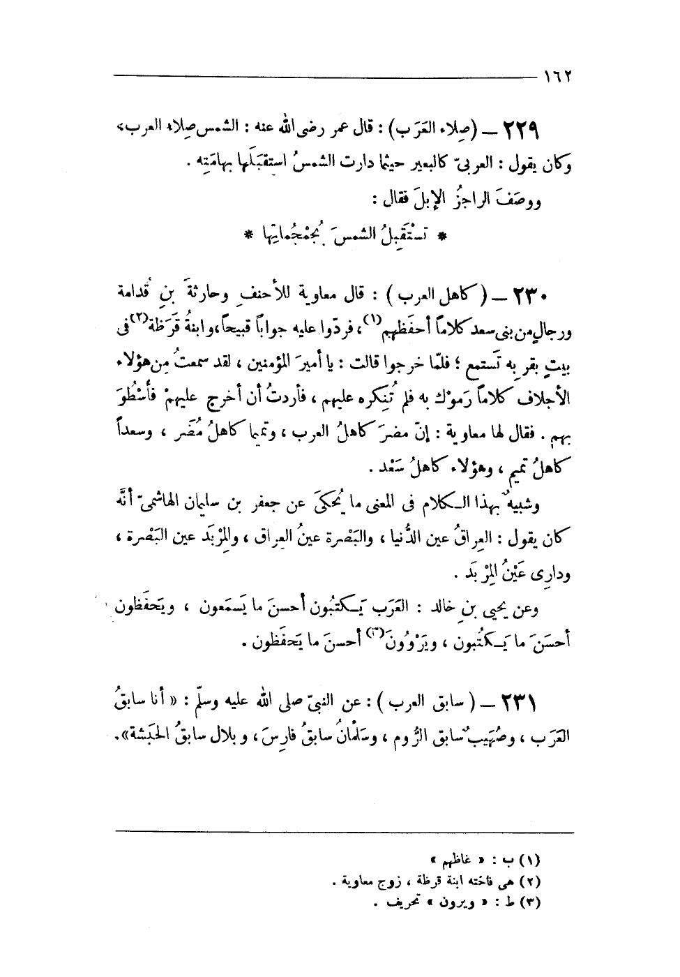 229 - (صلاء الْعَرَب) قَالَ عمر رضى الله عَنهُ الشَّمْس صلاء الْعَرَبِيّ وَكَانَ يَقُول الْعَرَب كالبعير حَيْثُمَا دارت الشَّمْس اسْتَقْبلهَا بهامته