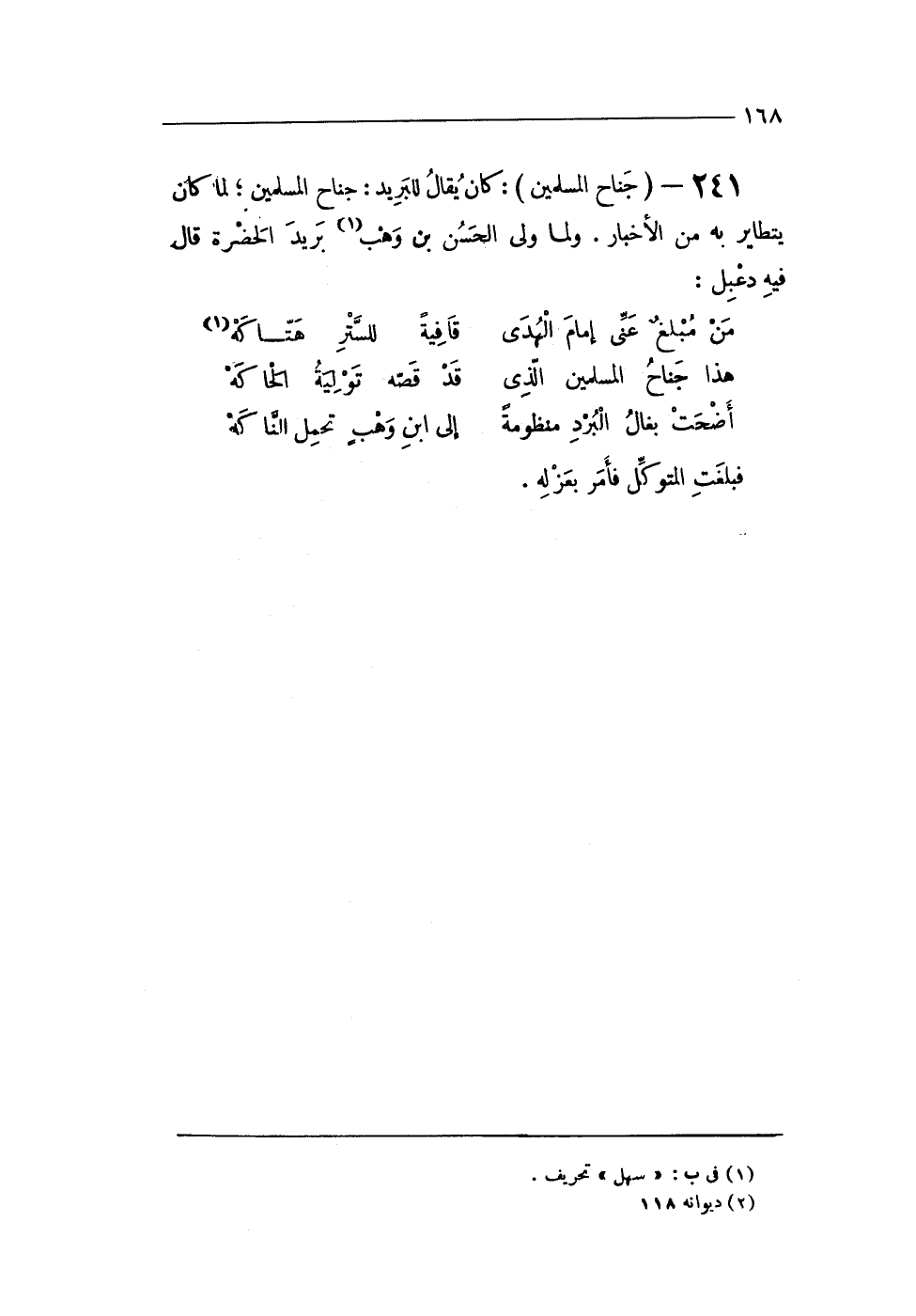 24 - (جنَاح الْمُسلمين) كَانَ يُقَال للبريد جنَاح الْمُسلمين لما كَانَ يتطاير بِهِ من الْأَخْبَار وَلما ولى الْحسن بن وهب بريد الحضرة قَالَ فِيهِ دعبل