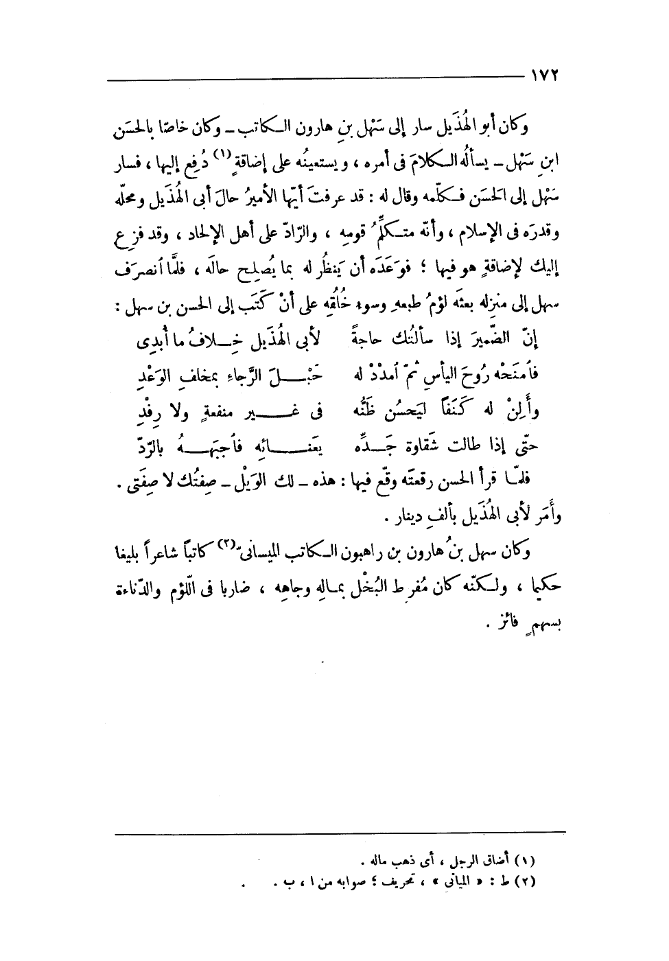 وَكَانَ سهل بن هَارُون بن راهبون الْكَاتِب الميسانى كَاتبا شَاعِرًا بليغا حكيما وَلكنه كَانَ مفرط الْبُخْل بِمَالِه وجاهه ضَارِبًا فى اللؤم والدناءة بِسَهْم فائز
